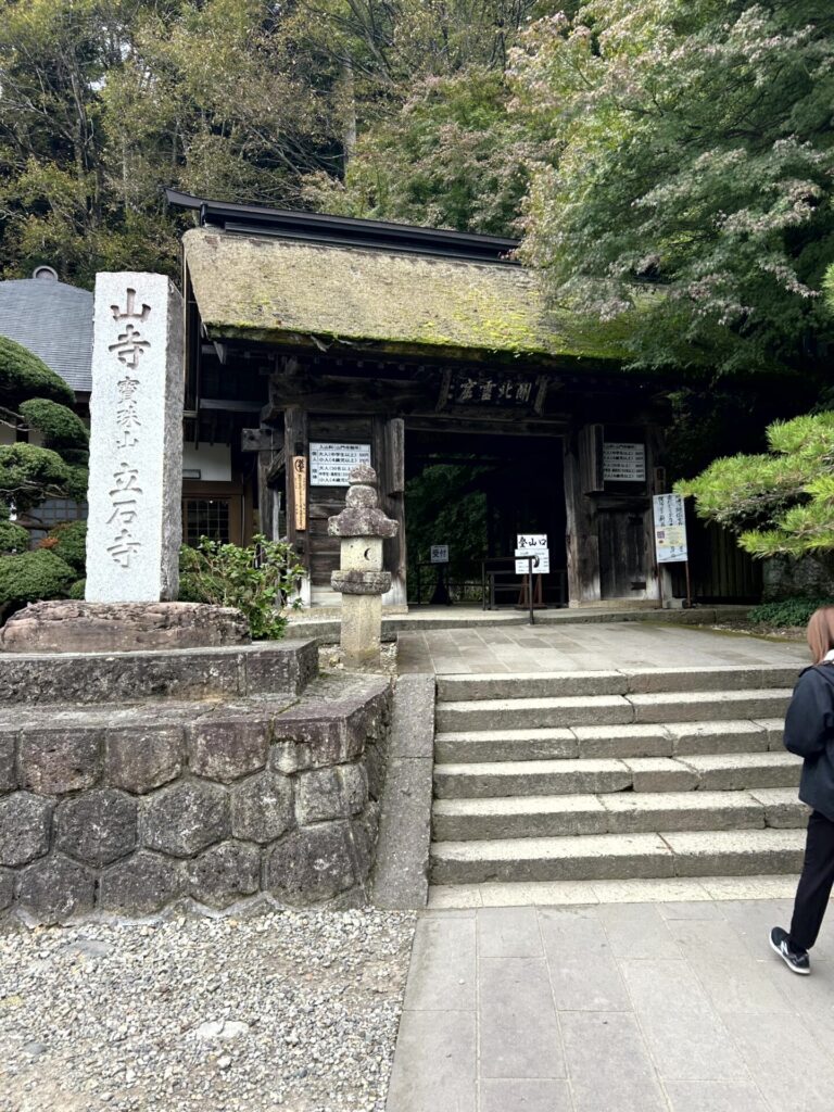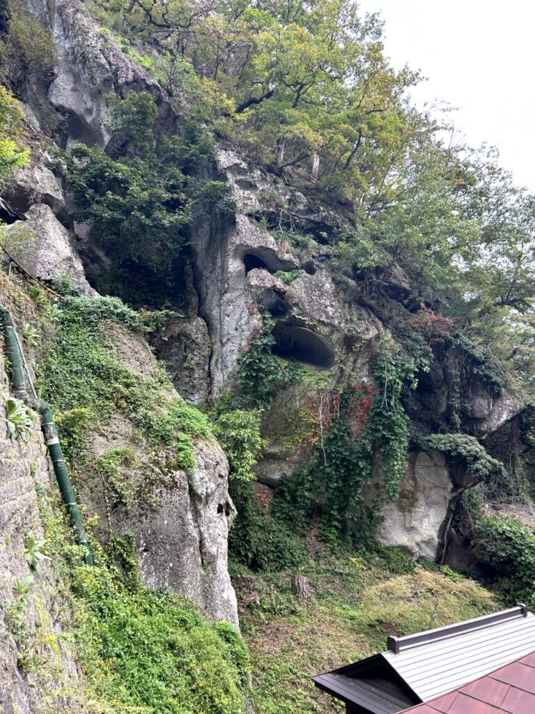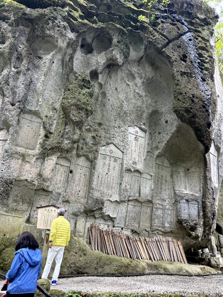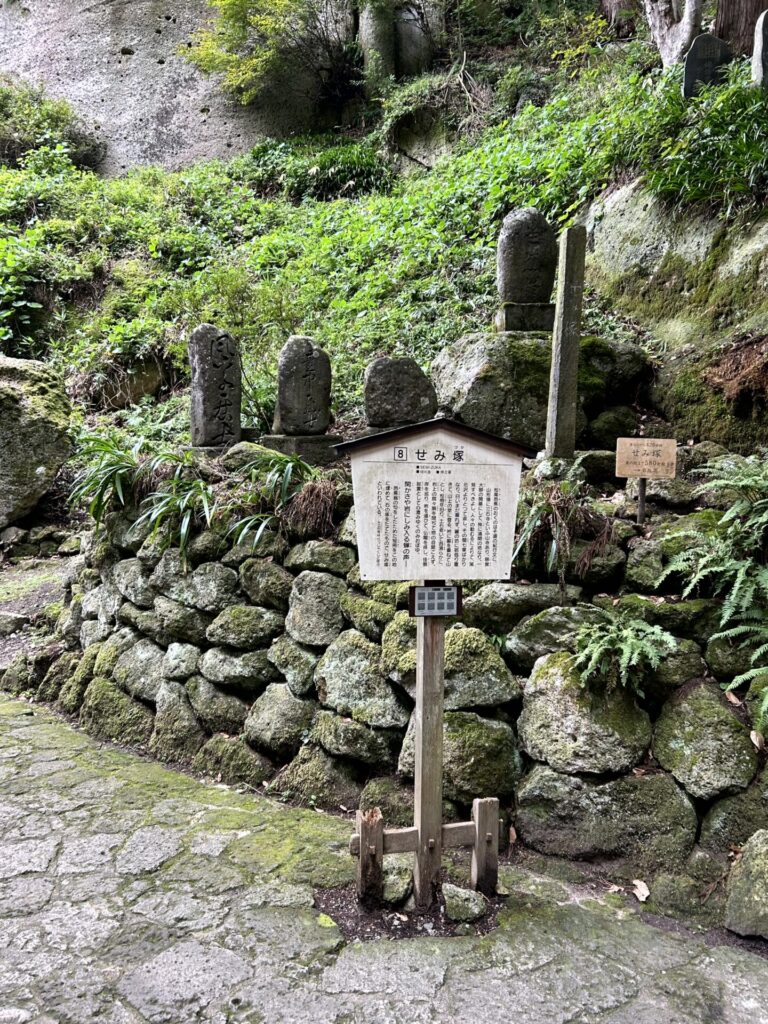 芭蕉の弟子たちがこの地を訪れ、この場所が芭蕉翁の句をしたためた場所ではないかと思い、翁の遺した短冊をこの地に埋めて塚を立てたものが「せみ塚」となっています。反対側の崖には、弥陀洞があります。風化した岩の表面が、阿弥陀如来の姿に見える人には、ご利益があると言われています。ようやく仁王門に到着です。立石寺の参道脇の断崖には、岩に掘られた窪みが多数見られます。これらは単なる自然の地形ではなく、修行者や信仰者の供養のために設けられたもので、お墓としての利用もあるようです。