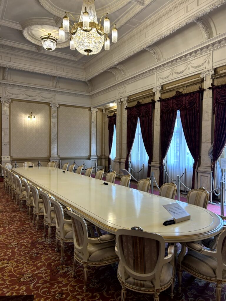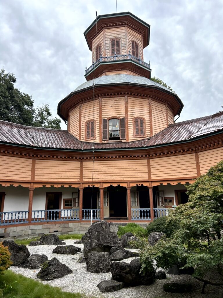 市内に入る前に、馬見ヶ崎川沿いの日本一の芋煮会フェスティバル会場そばにある大鍋、三代目「鍋太郎」直径6.5mを見学します。当然日本一です。次に市内に入り旧山形県庁および県会議事堂であった「文翔館」の見学です。この建物は1916年完成、英国近世復興様式で、大正建築の傑作と言われており、国の重要文化財に指定されています。現在は山形県郷土館として、山形の歴史や文化、文学が紹介されています。