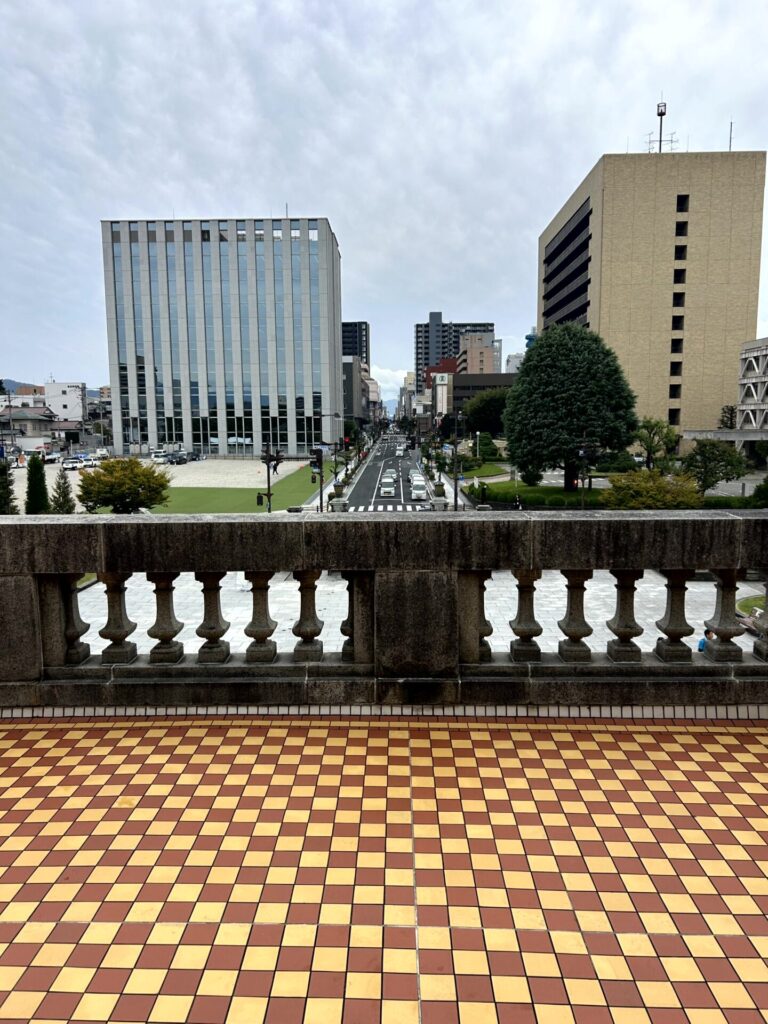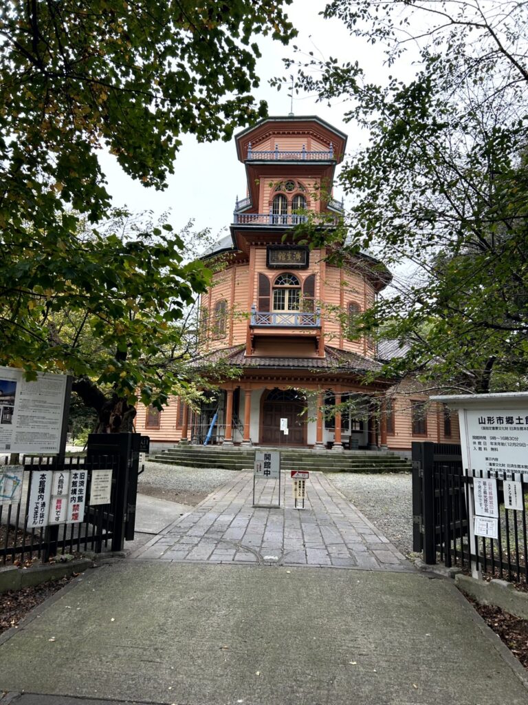 現在の城郭は11代城主最上義光が築いたものが原型とされています。二ノ丸東大手門が復元されており、そこから霞城公園に入ります。最上義光(よしあき)騎馬像の前を過ぎると、正面に特徴ある形式の山形市郷土館(旧済生館本館)が見えてきます。この建物は1878年に建てられ、最初は県立病院として、その後市立病院済生館の本館として使用されていました。当初は医学校も作られ、オーストリア人石医師ローレツ博士が招聘されています。
