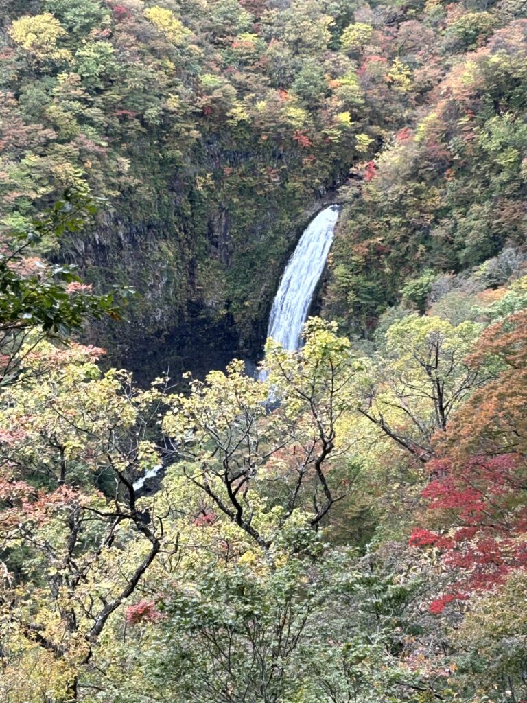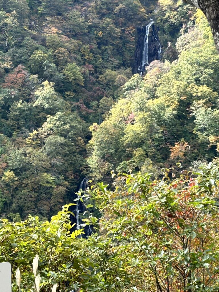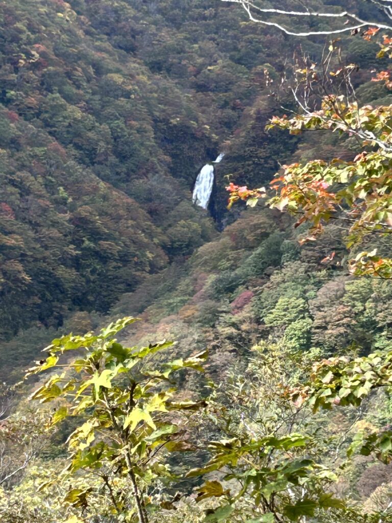 今日は蔵王に向かいます。窓から外を見ると晴れてはいますが、山の上を雲が厚くす覆っています。蔵王ドライブの最初は滝見台で、そこからは、三階滝(高さ181mで日本の滝百選の一つ)と不動滝(高さ53.5m)が見えます。(追記:ブラタモリ で10/25(土)・11/1(土)、これから行く御釜と蔵王温泉を放映していました)