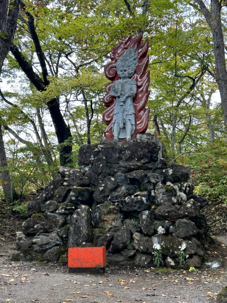 そこから車で少し行くと蔵王不動尊があります。真っ赤に燃え盛る炎を背にした不動明王です。ここから近くの高台からは、不動滝をより間近に眺められます。