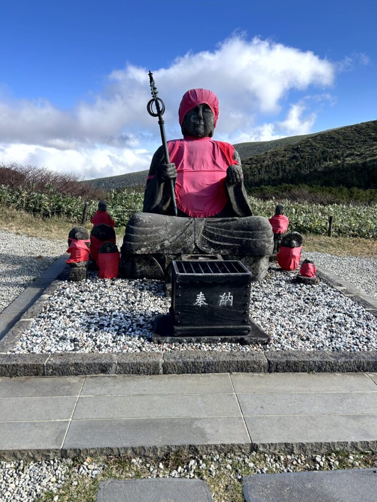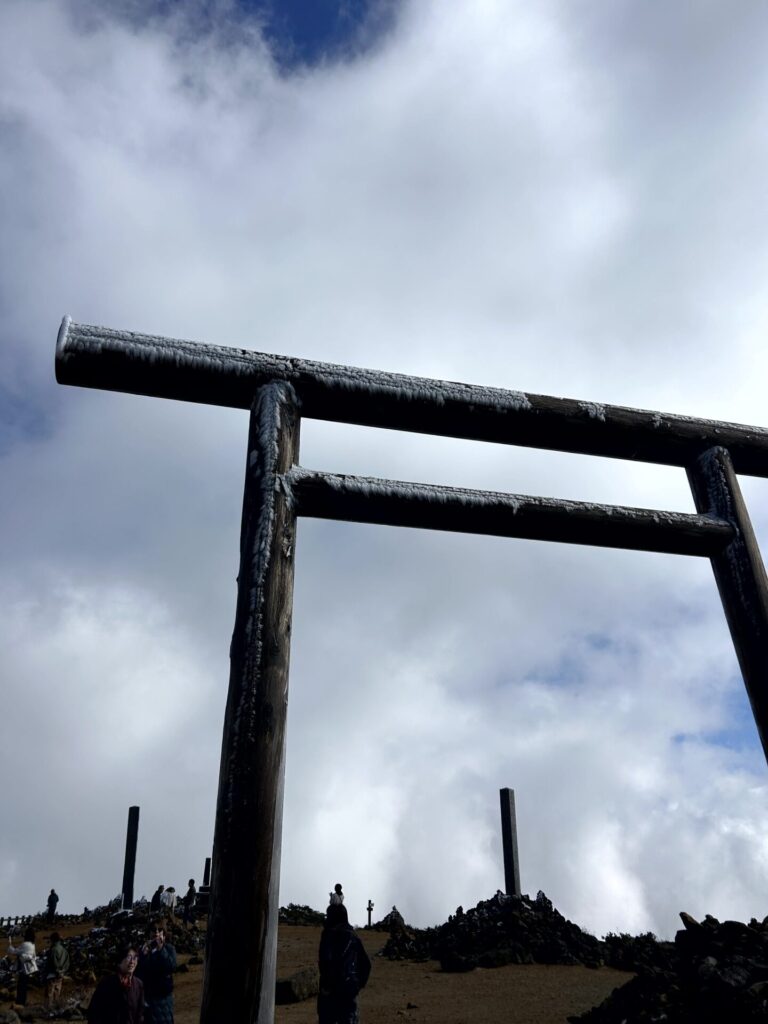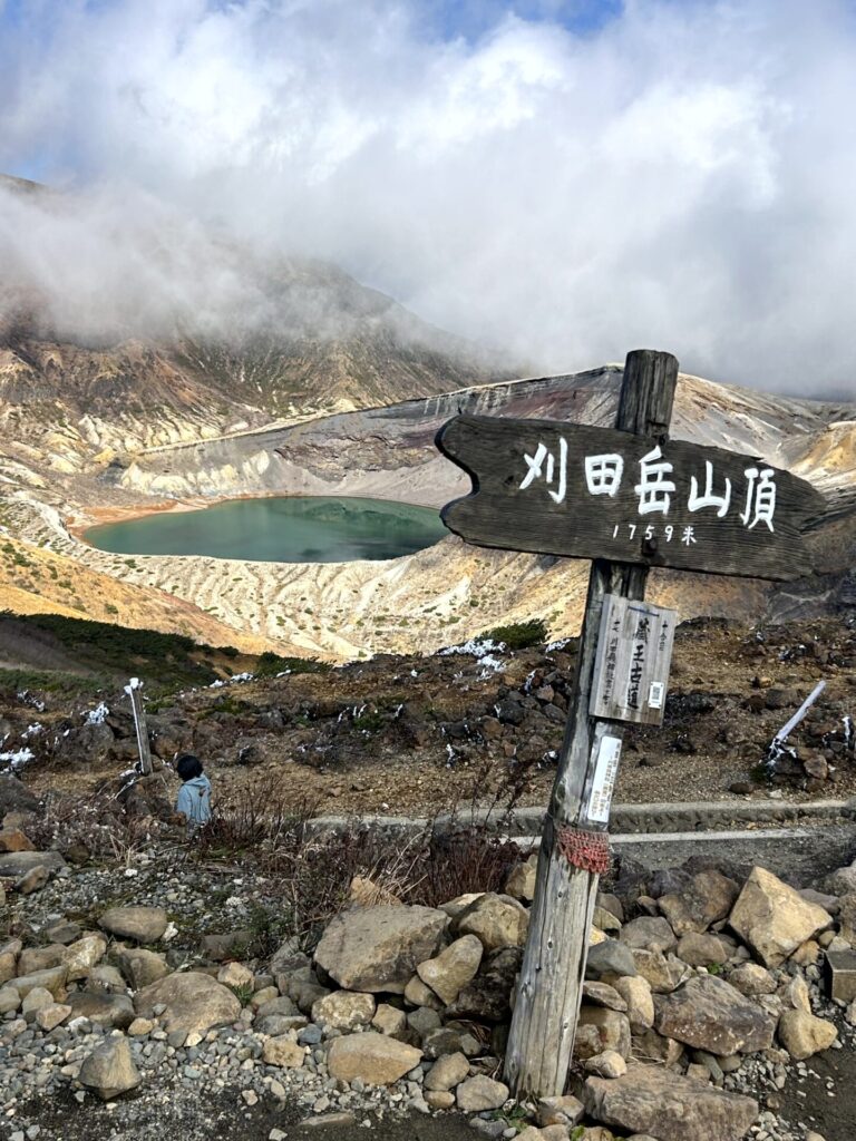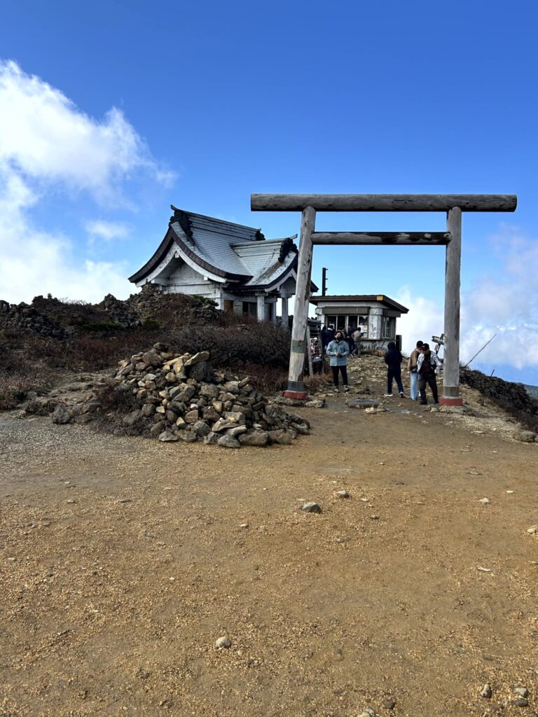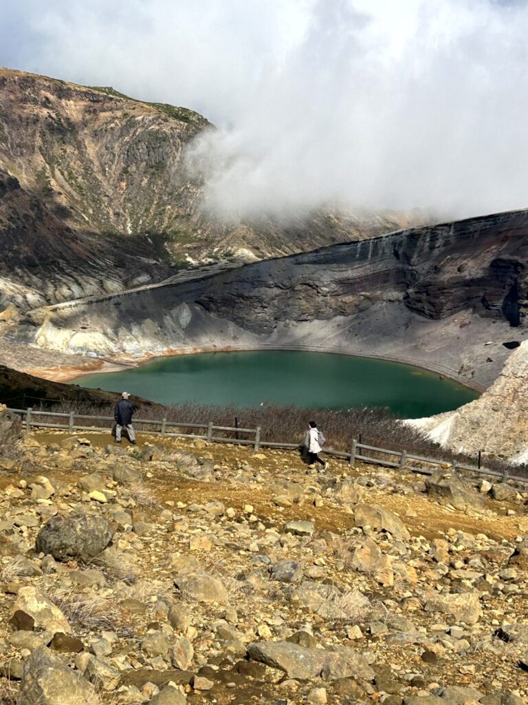 今日のメインの御釜に向かいます。御釜は約800年前に出来た噴火口とされ、水質はpH3.5の強酸性で、生物は一切生息していないようです。御釜に隣接する刈田岳(1758m)山頂にある蔵王刈田嶺神社奥宮は、麓の蔵王刈田嶺神社里宮からの蔵王古道の終着点です。滝見台からは車で通ってきました。ところで、御釜周辺は1894年以後噴火していませんが、地震微動は有り、御釜の向こう側にある馬の背カルデラは、想定火口域とのこと。警報が鳴ったら直ぐに、蔵王山頂レストハウスへの避難が必要になります。