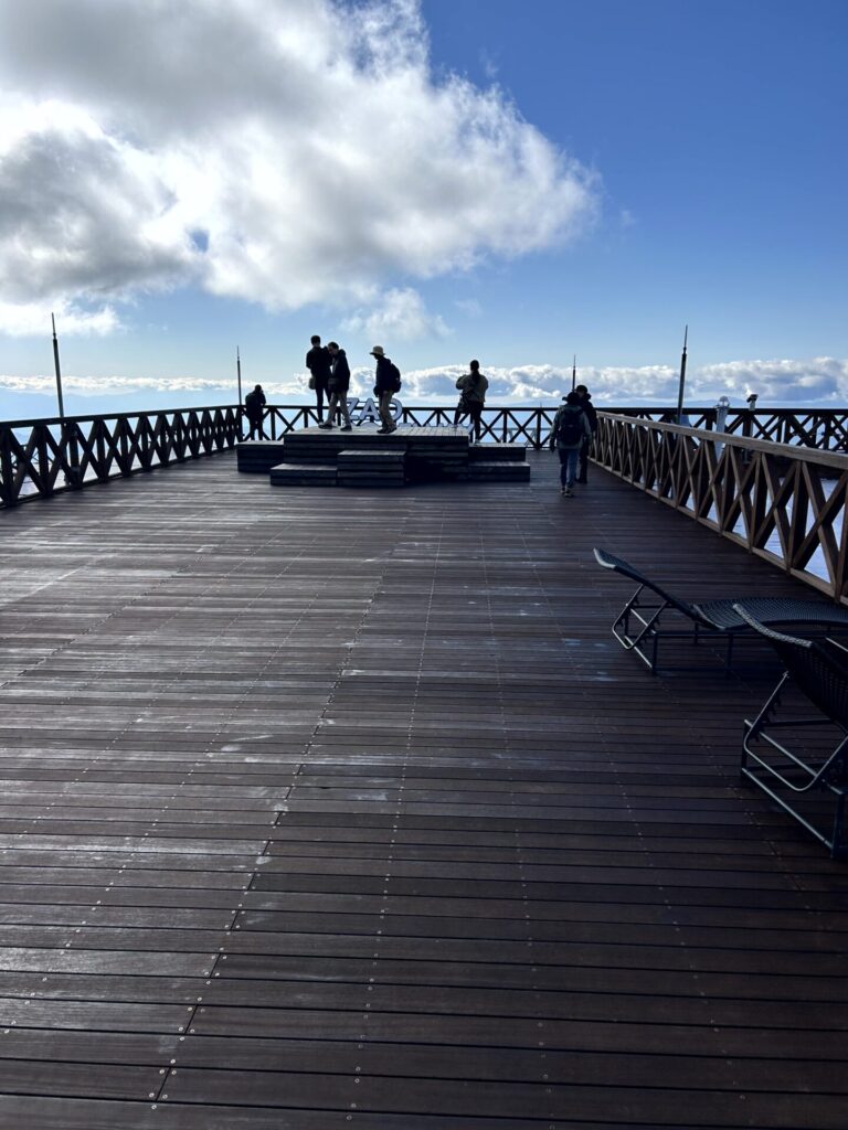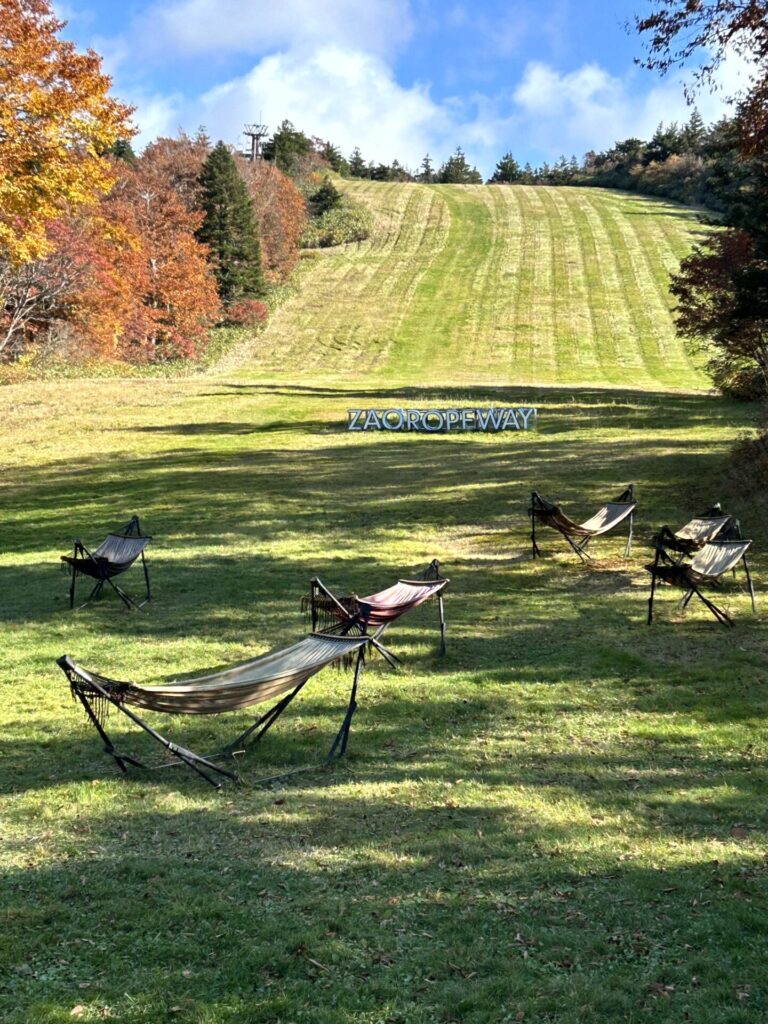 山頂は寒いので、中腹の樹氷高原駅に戻ります。丁度日も出て暖かくなってきましたので、ハンモック広場でハンモックの上で横になったり、百万人テラスで、ソファーに腰掛けながら下界を見おろします。