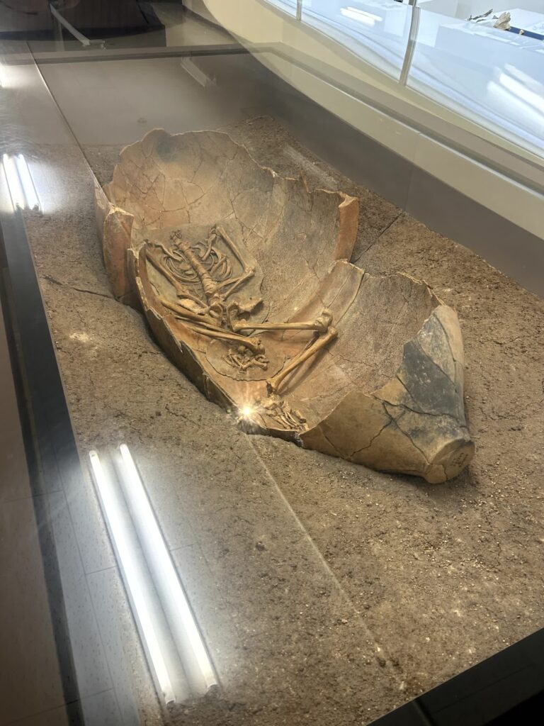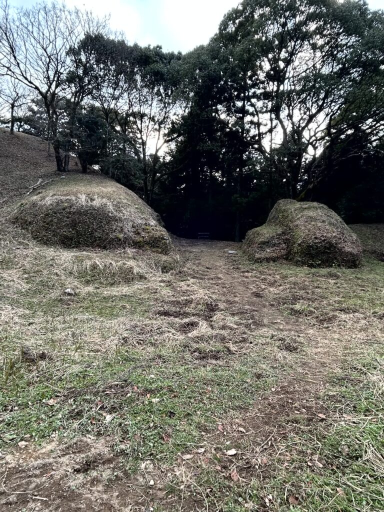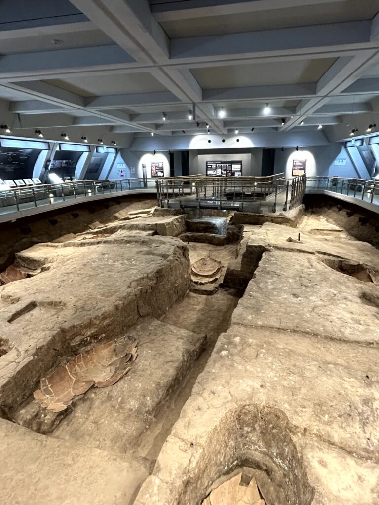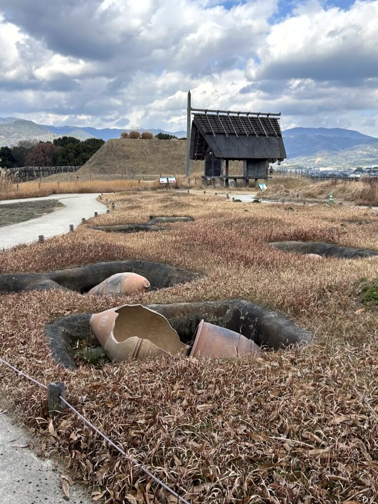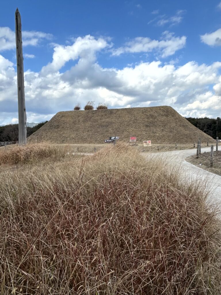 次はお墓のエリアに行きます。北側にはピラミッドのような巨大な北墳丘墓が有り、内部では甕棺の発掘状況が展示されています。ここは王やそれに近い身分の人が埋葬された場所です。手前の原っぱには、庶民の遺体が埋葬された甕棺が、300m、500基の墓列があります。