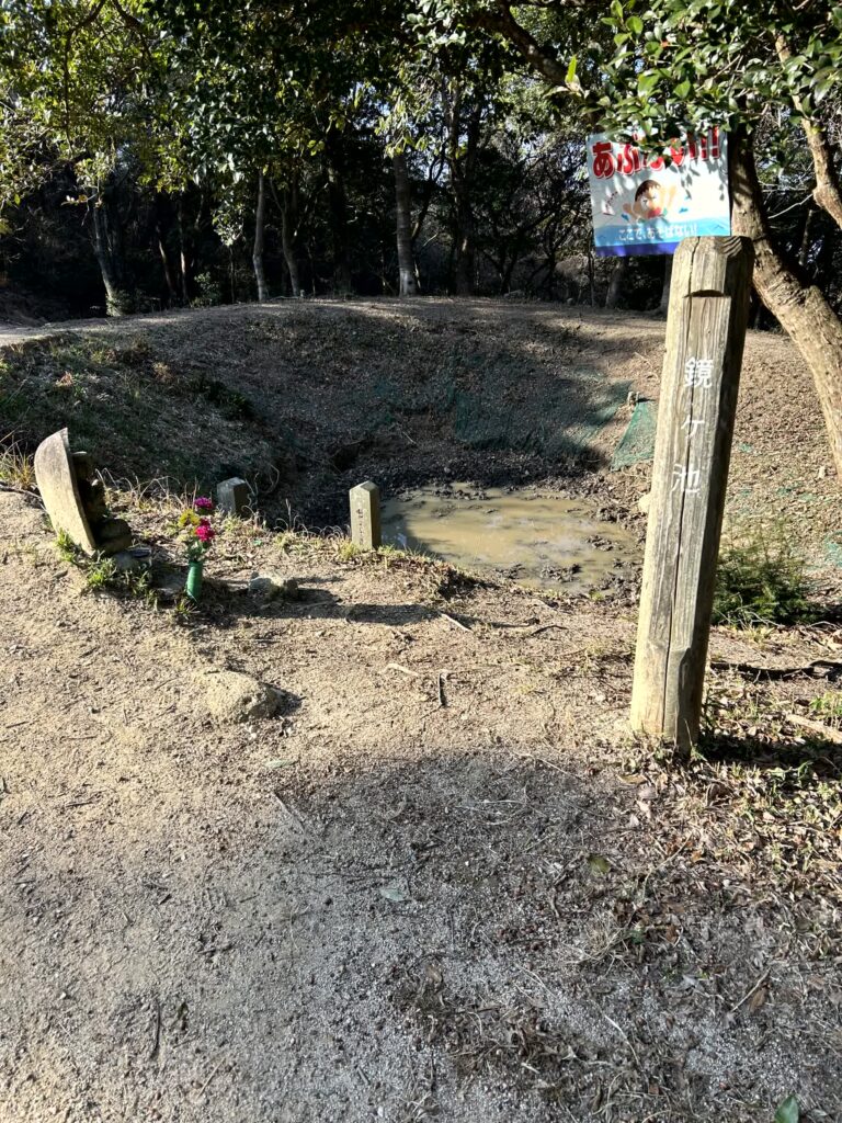 少し下ったところに大宰府口城門跡があります。山の麓の大宰府政庁と、ここで行き来していたのでしょうか。道路の反対側には、4棟分の高床式倉庫の礎石である増長天礎石群があります。説明文には、倉庫の高さは8mで1棟に5~600人の1年分の稲穀が蓄えられていた、とあります。この景色からは想像も出来ませんね。そばに小さな「鏡ヶ池」があり、当時の井戸と考えられています。ここで雨乞いのため鏡を投じたとの言い伝えがあるため、「鏡ヶ池」と呼ばれているようです。
