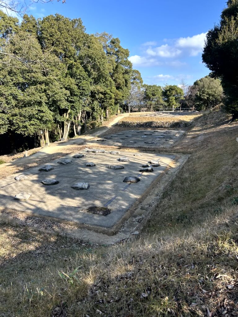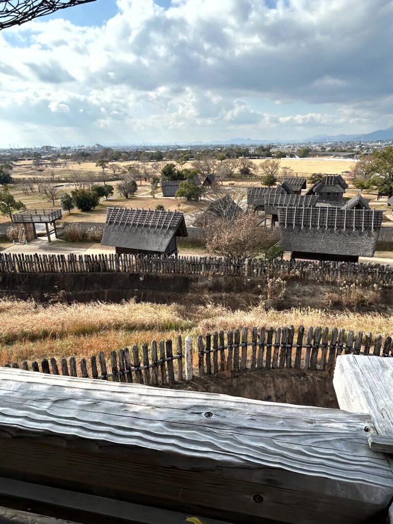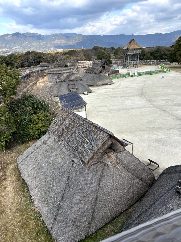 集落はいろいろなエリアに分かれていますが、王たちの家がある南内郭から見学します。このエリアは塀で囲まれ、物見やぐらが四棟も建っており警備が厳重なことが伺えます。物見やぐらからは、集落一面が見渡せます。