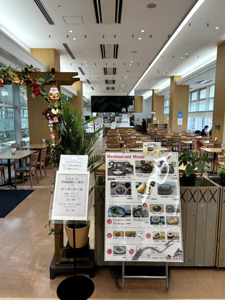 次は佐賀、吉野ヶ里歴史公園に向かいます。お昼時ですので、歴史公園センター(東口)にある吉野ヶ里歴史公園レストランで、古代貝汁御膳と佐賀の恵みハンバーグ定食を頂きました。古代貝汁御膳はアサリの味噌汁、わらすぼ(有明海のみに生息する、ハゼ科の魚)、いか焼売、赤米、みつせ鶏(佐賀県で飼育されているフランス系赤鶏をルーツに持つ銘柄鶏)での混ぜご飯でした。この御膳は、わらすぼとムツゴロウの炙りが交互に出るとのことなので、売店で、ムツゴロウの干物を買ってみました。