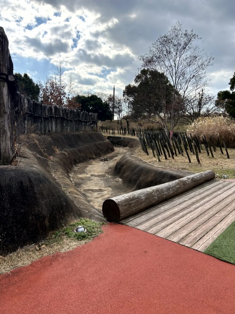 昼食後、さっそく公園東口から中に入ります。入り口からは田手川を跨ぐ幅のとても広い天の浮橋を通って、環濠入り口まで行きます。環濠は堀と城壁で囲まれ、堀の内側には防御のため先を尖らした乱杭もあります。集落全体が守りをかためており、弥生時代は思った以上に戦があったようです。