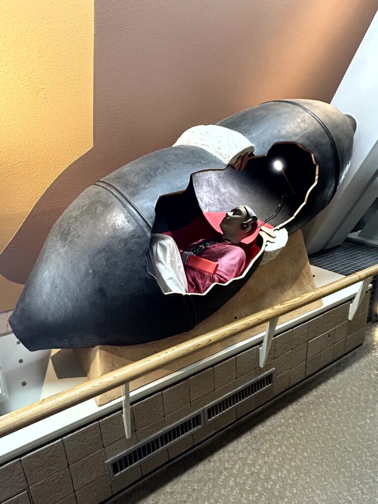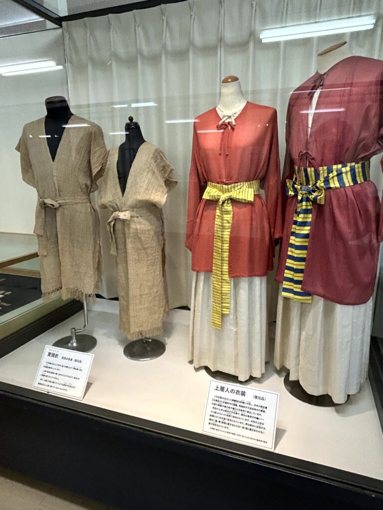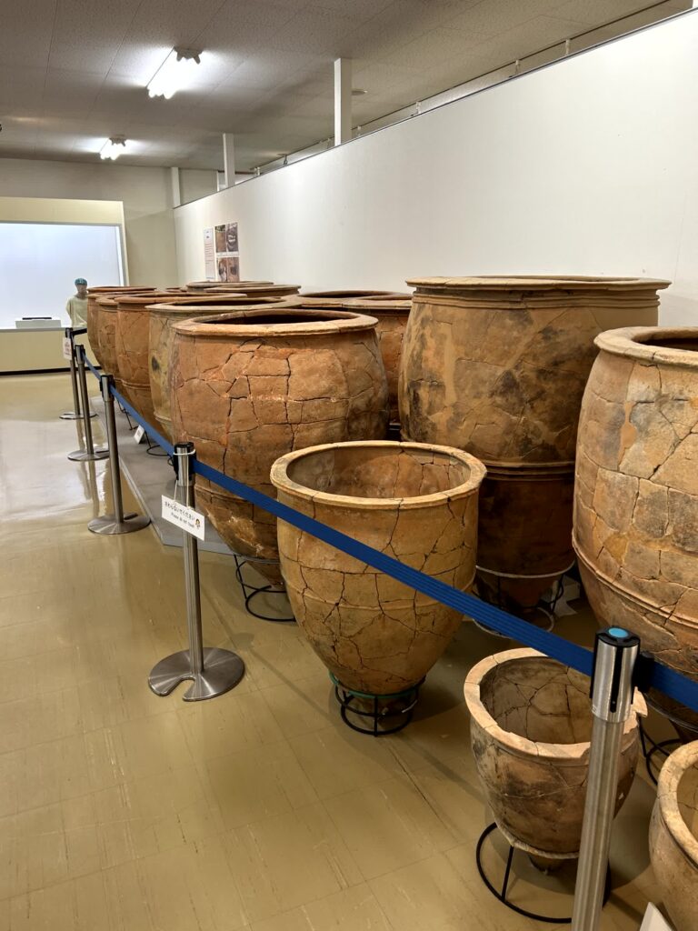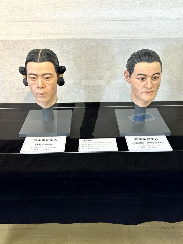 入口そばの展示室に入ってみます。出土した甕棺が多く展示されていますが、遺体を、二つの甕棺を左右につなげた中に入れて埋葬する、ということをここで初めて知りました。また、上層人と庶民の衣裳の違い、渡来人(吉野ヶ里地区)と在来系(唐津地区)の人相の違いなど、興味深い展示があります。