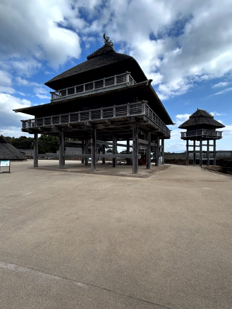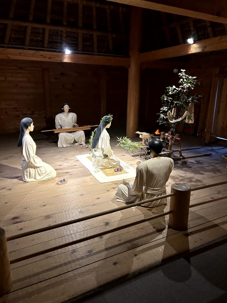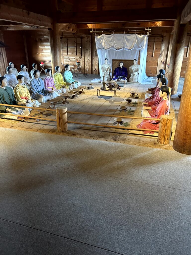次はその隣にある北内郭です。ここは、巨大な主祭殿や物見やぐらが発掘された場所で、祭祀儀礼や政治を行う場所であったようです。二重の堀や高い柵があり、厳重に警護されているようです。2階は主祭殿での重要な祭祀のあとの宴会の様子、3階はクニの最高司祭者が祖霊からのお告げを聞くために祈っている様子が展示されています。主祭殿の隣には、最高司祭者の住居がありますが、最高司祭者はこのエリアの外には出なかったようです。