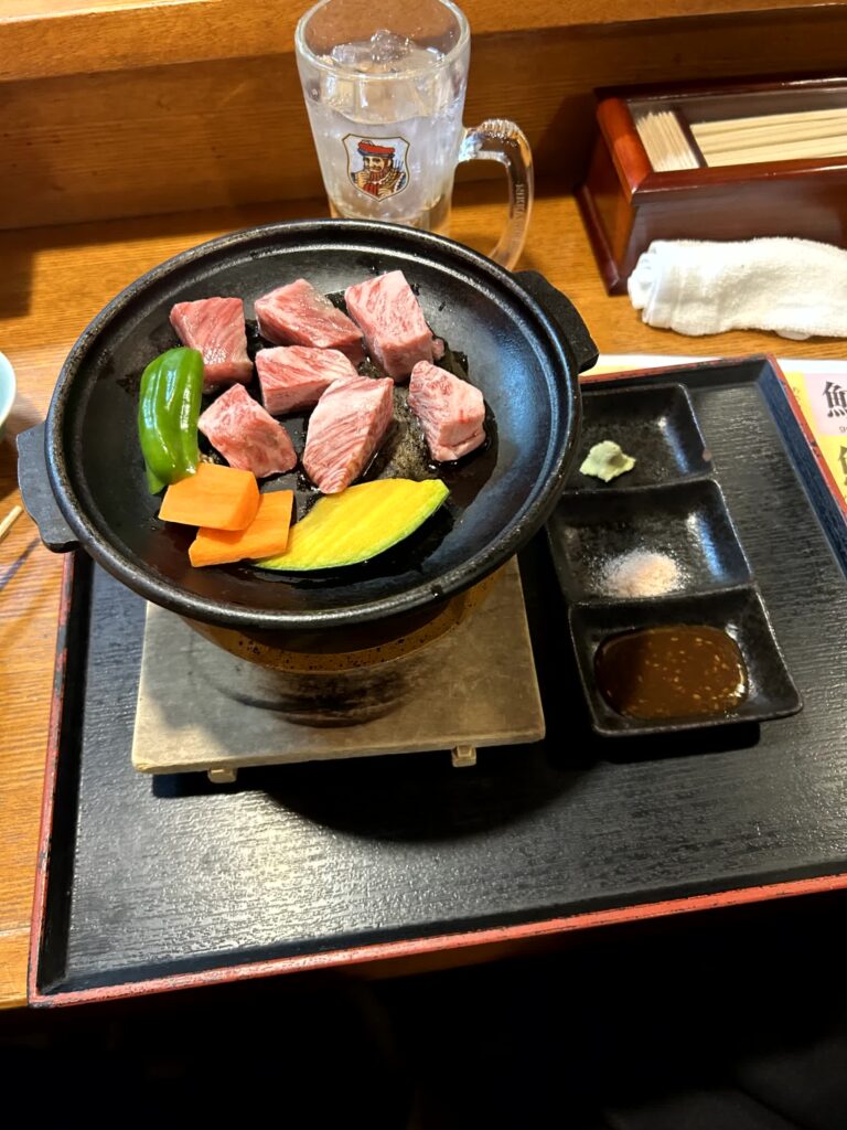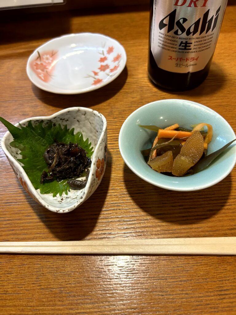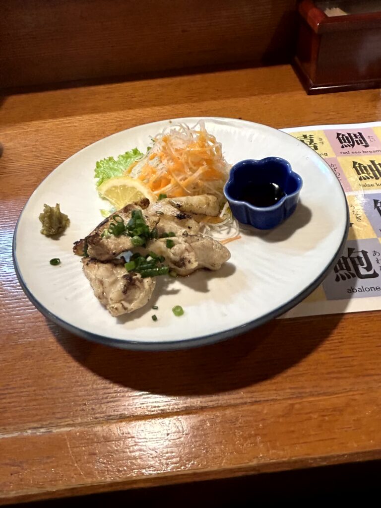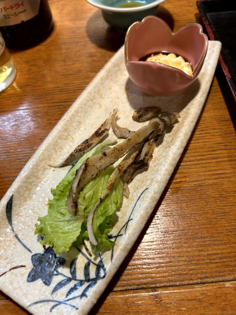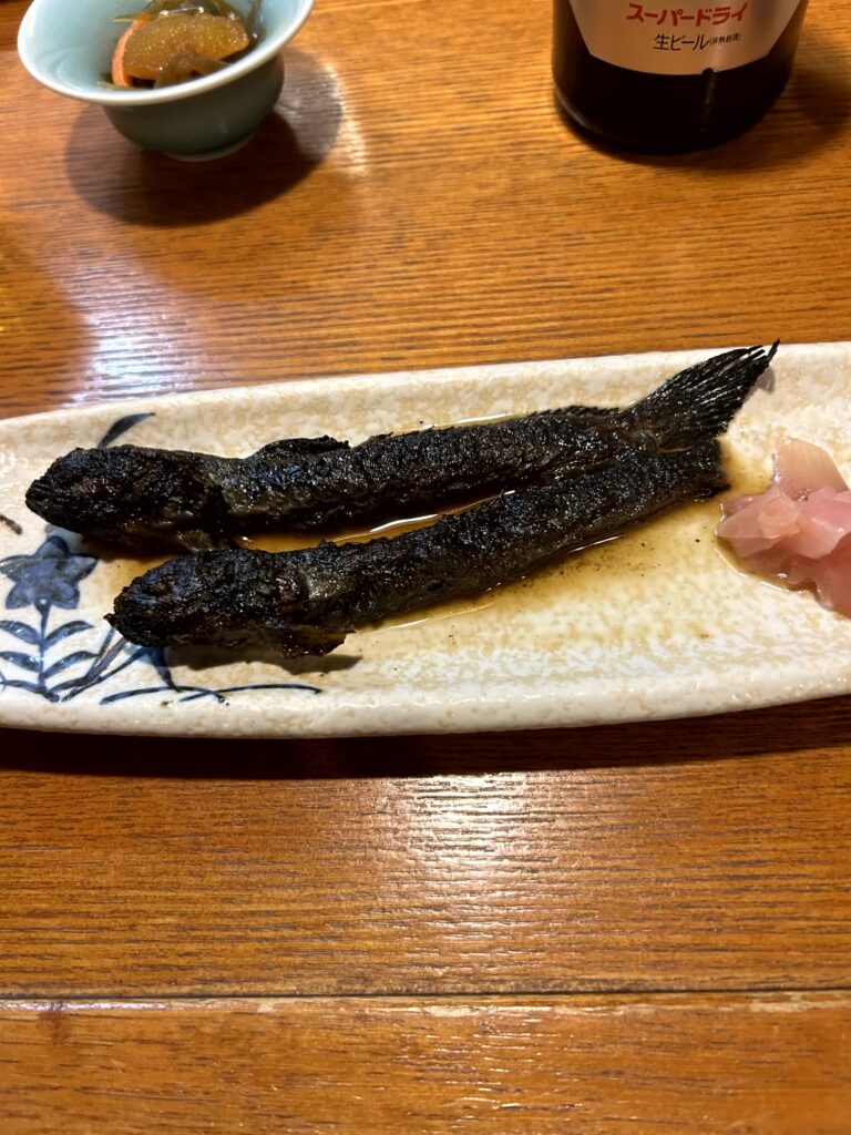今日の夕食は、ホテルそばの第三吉(きち)丸に入ってみます。まずは佐賀の地元食、ガニ漬け(小型のカニの塩辛)、ムツゴロウの煮付け、うみたけ(ミル貝のような見た目の大きな水管が特徴の二枚貝、その水管を食す)の一夜干しをトライしてみます。お酒は小城市の「天山」です。後も佐賀尽くしで、佐賀牛のサイコロステーキ、みつぜ地鶏の塩焼、いか焼売と続きました。佐賀を堪能した夜となりました。