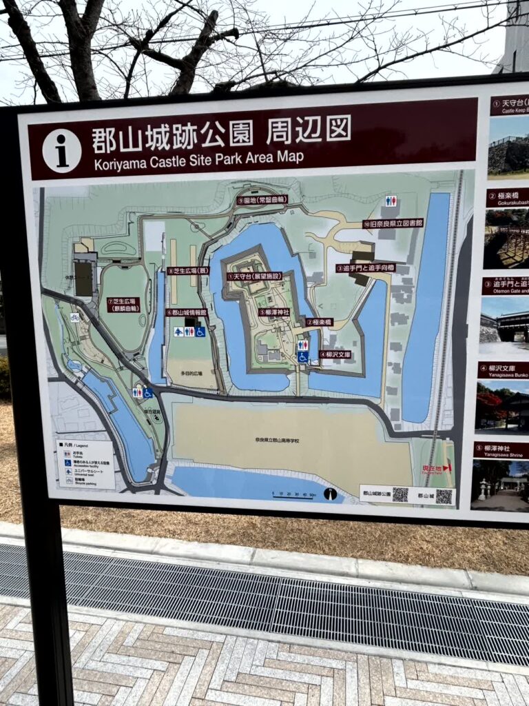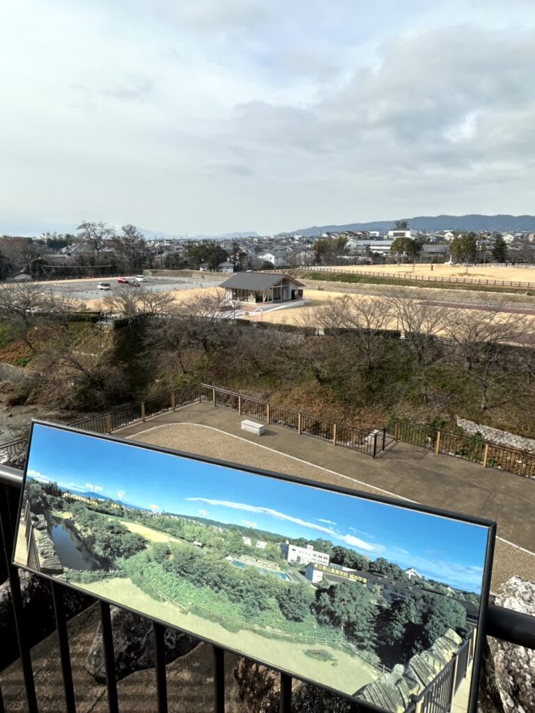 さっそく天守台に上り、周辺を眺めてみます。ここからは東大寺の屋根が見えるとのことでしたが、今は見えません。但し、薬師寺の二本の三重塔は見えます。一帯は現在、郡山城跡公園として、急ピッチで整備しているようです。