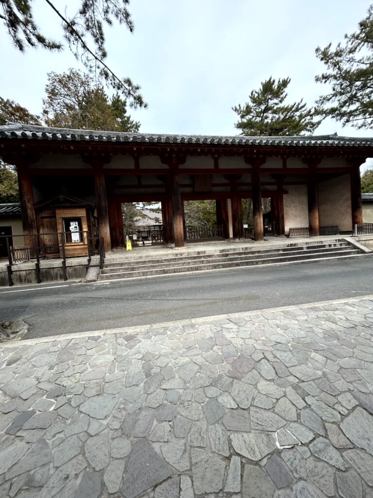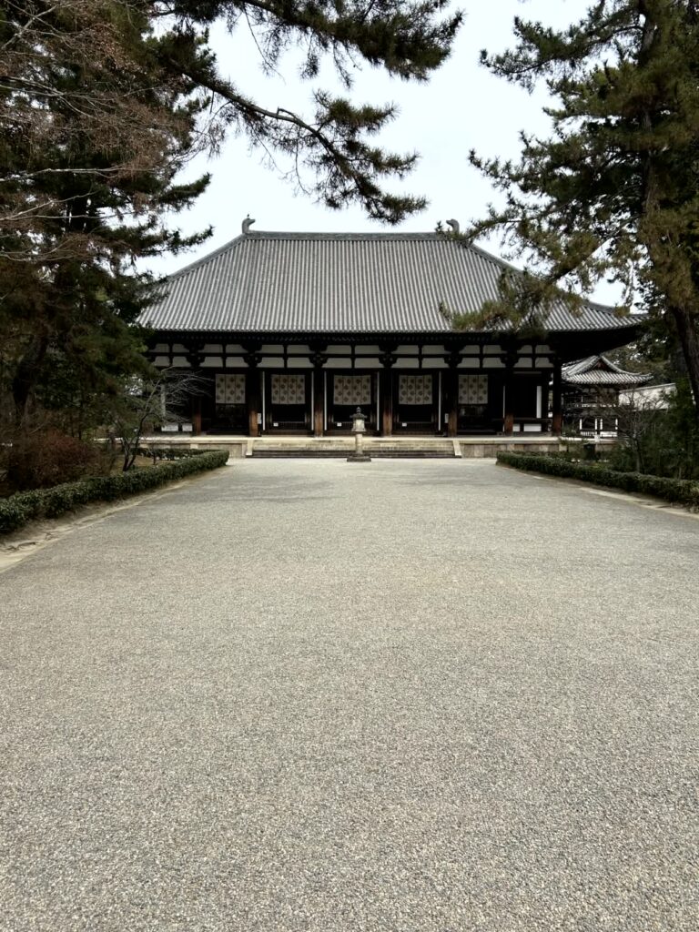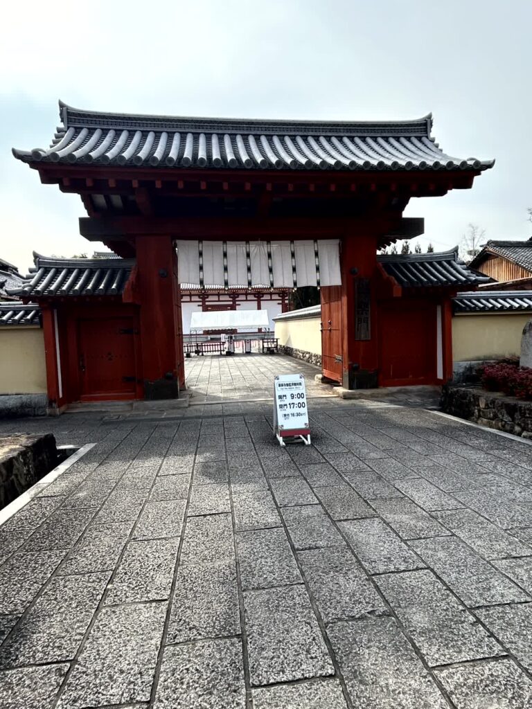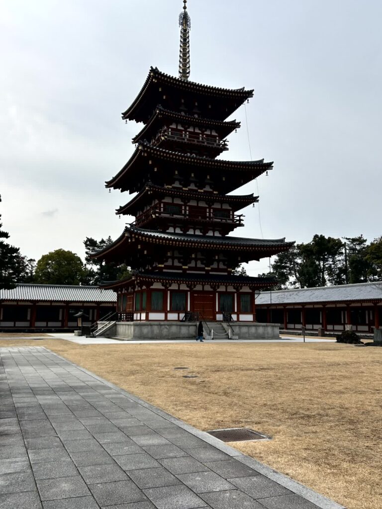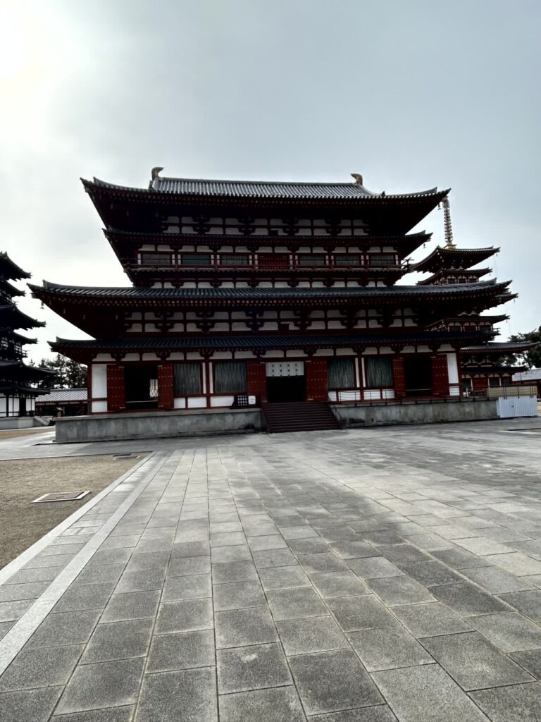 次は再び近鉄橿原線に乗り、西ノ京駅で降り、薬師寺に向かいます。5分程で興楽門に到着します。そこから境内に入り、御朱印受付や売店のある東僧坊を抜けると、目の前に大講堂と金堂が現れます。いずれの建物も再建された建物ですが、中にある仏像は国宝揃いです。