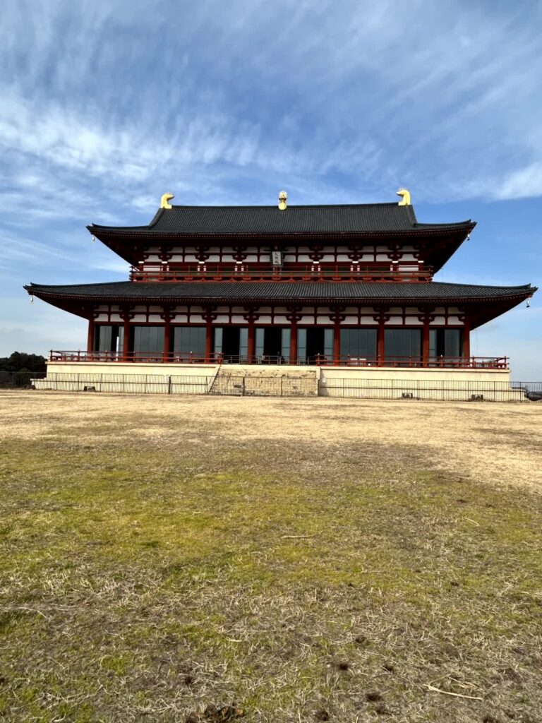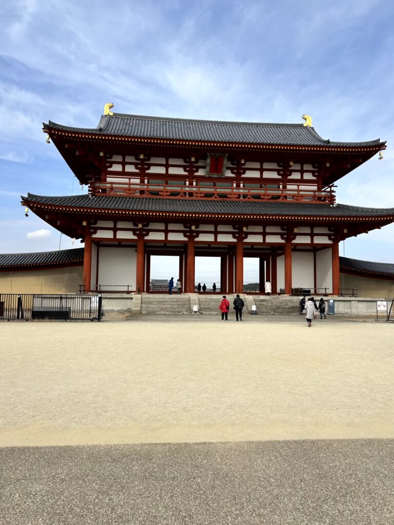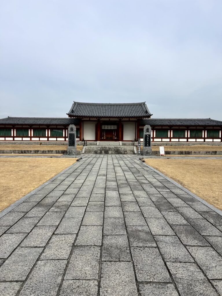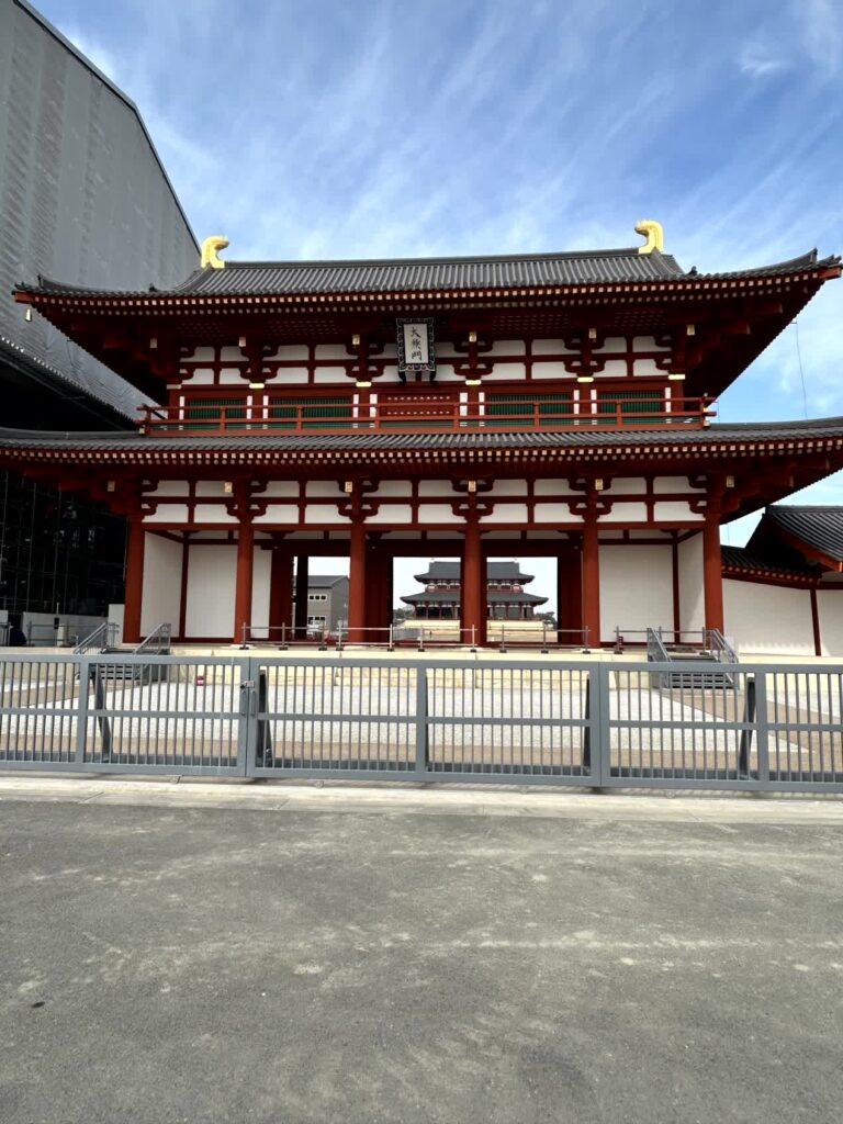 平城宮跡内を通過する近鉄奈良線を超えて、南門に向かいます。自転車でも5分くらいかかります。南門は現在工事中のため、中には入れませんが、大極門の向こうには、第一次大極殿(平城京遷都710年~恭仁京遷都740年の間使用)が見えます。自転車で向かいます。大極殿は天皇の即位式や重要な国家儀式で使われていた施設で、周囲は、かつては回廊で囲まれていました。内部には天皇が着座するための高御座も展示されています。