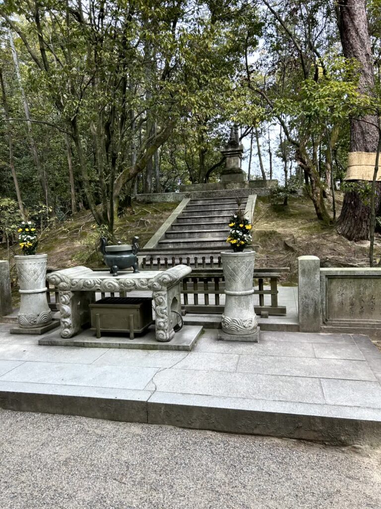 開山御廟は、緑深い木立の中にあります。鑑真和上が亡くなってから1250年たちますが、参拝する人は途絶えないそうです。和上の姿を写した「御身代わり像」が、開山堂に祀られていますので、参拝します。最後は、正式な僧となるための授戒の儀式を行っていた戒壇に行きます。今は、基壇のみが残るだけです。