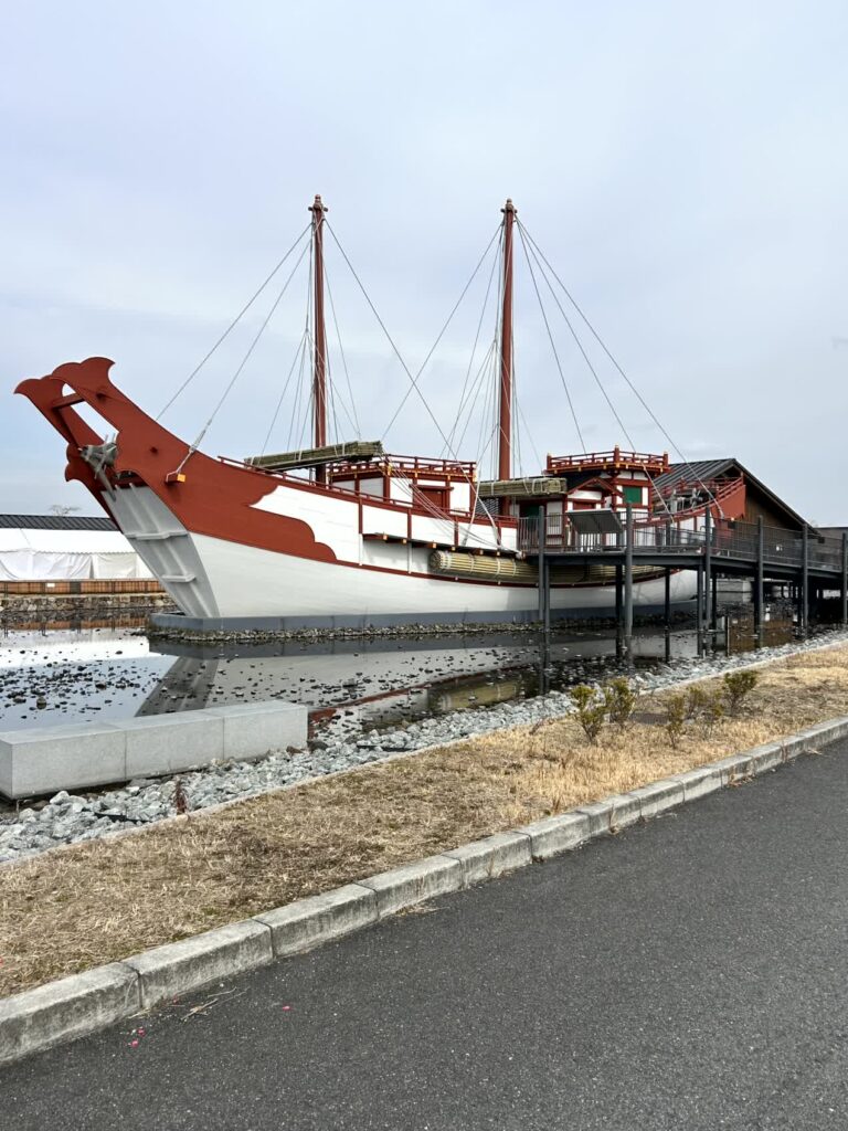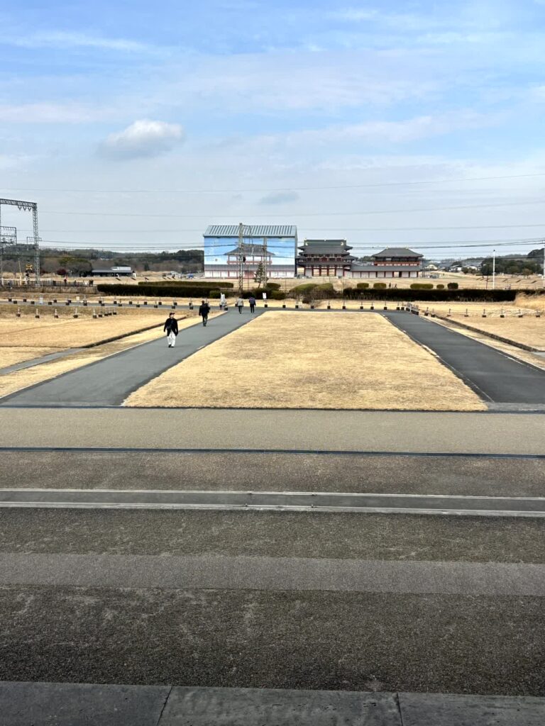 食後はいよいよ平城宮跡に入ります。徒歩で5分ほどです。入口には、迫力ある復元遣唐使船が置かれています。なにせ平城宮跡はとても広い(130ha)ので、自転車での見学が必須です。天平みはらし館で、借りることにします。見学は朱雀門からスタート。朱雀門からは、遠くに大極門、東楼(ほぼ完成)、西楼(復元中)からなる南門が小さく見えます。