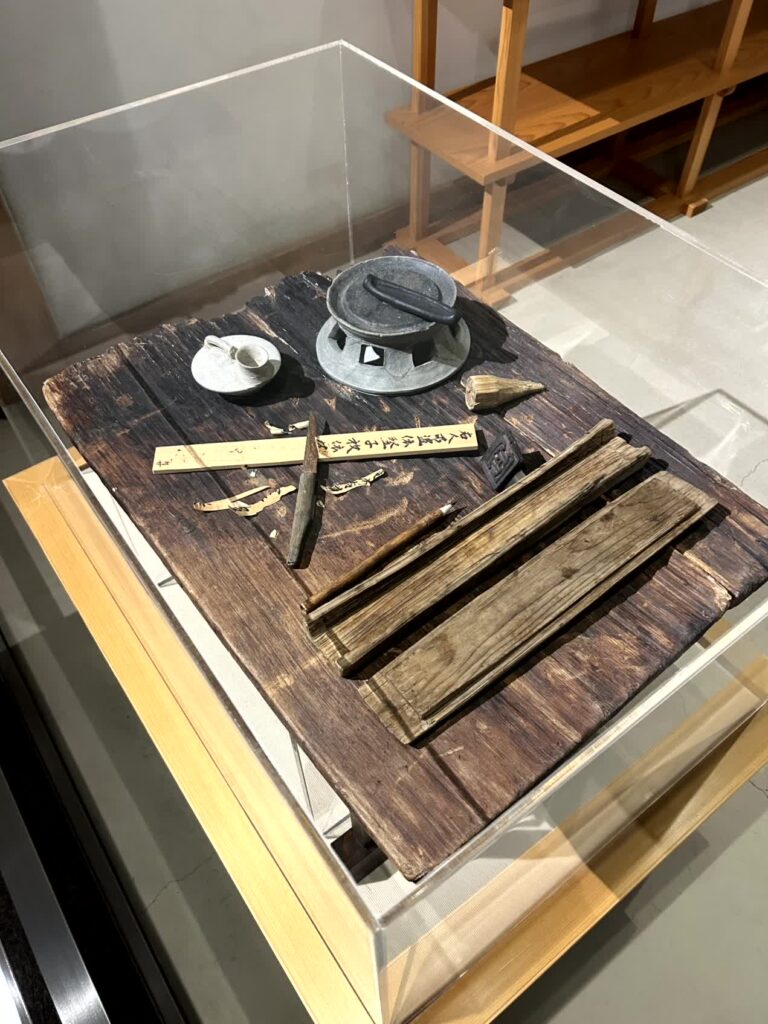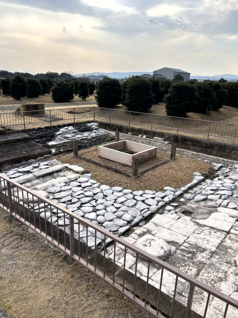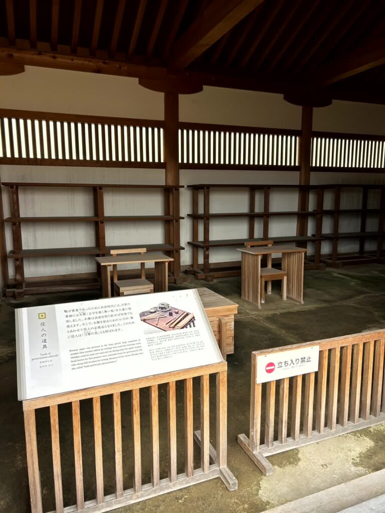 内裏と遺構展示館の間に、天皇家のための役所である推定宮内省があります。役所では、土間に机と椅子を置き執務したと考えらるそうです。机は正倉院宝物の復元品とのこと。推定宮内省のそばで、井戸跡が発見され、当時に近い状態で復元展示されています。