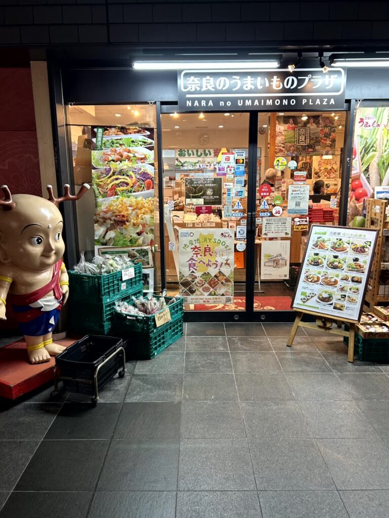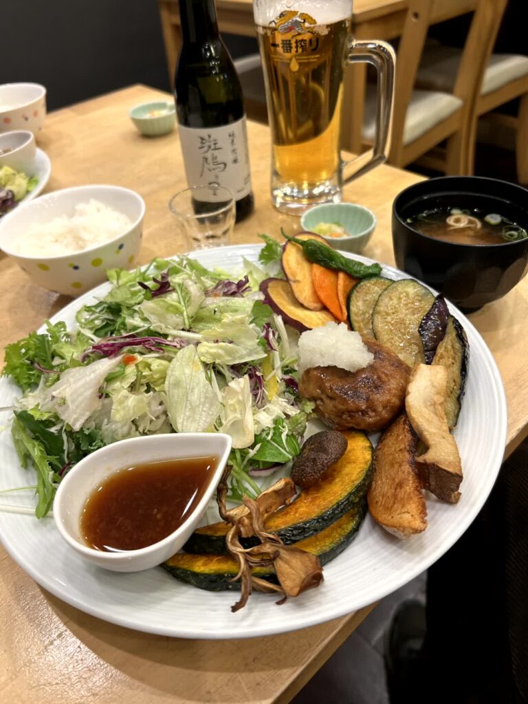 今晩の夕食は、当初の予定通りJR奈良駅ホーム下の「奈良のうまいものプラザ」の農園直送レストラン「古都華」で頂くことにします。奈良の銘柄牛「大和牛」のハンバーグとたっぷりの地元野菜、奈良のお米「ヒノヒカリ」のごはんのセットです。添えられている野菜は超ボリュームが有ります。それと、法隆寺をイメージして造られたという純米大吟醸「斑鳩の里(千代酒造、御所市)」。奈良づくしです!