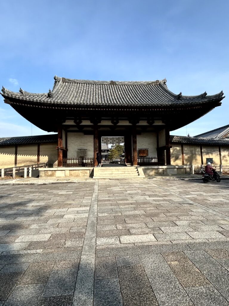最終日の今日は、法隆寺を中心に、斑鳩エリアをまわりたいと思います。JR大和路線の法隆寺駅で降り、駅前のコーヒーショップ「ゲーブル」で、さっそく自転車を借ります。10分ほどで法隆寺参道に到着しますので、南大門の脇に駐輪します。南大門の下をくぐると、正面には中門、その奥に五重塔や金堂を中心とする西院伽藍が見え、です。