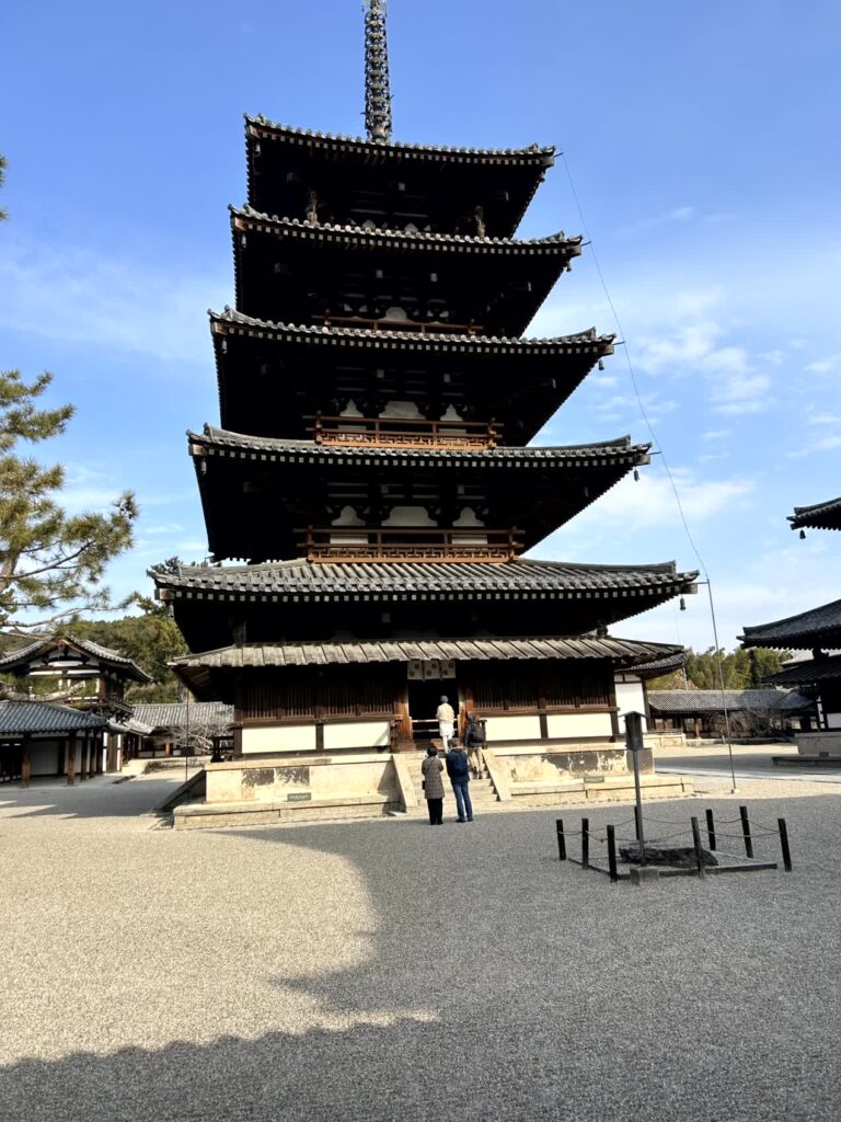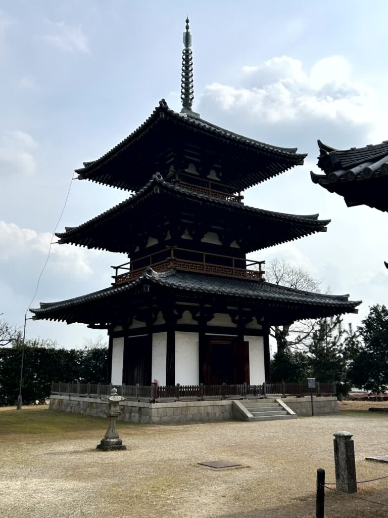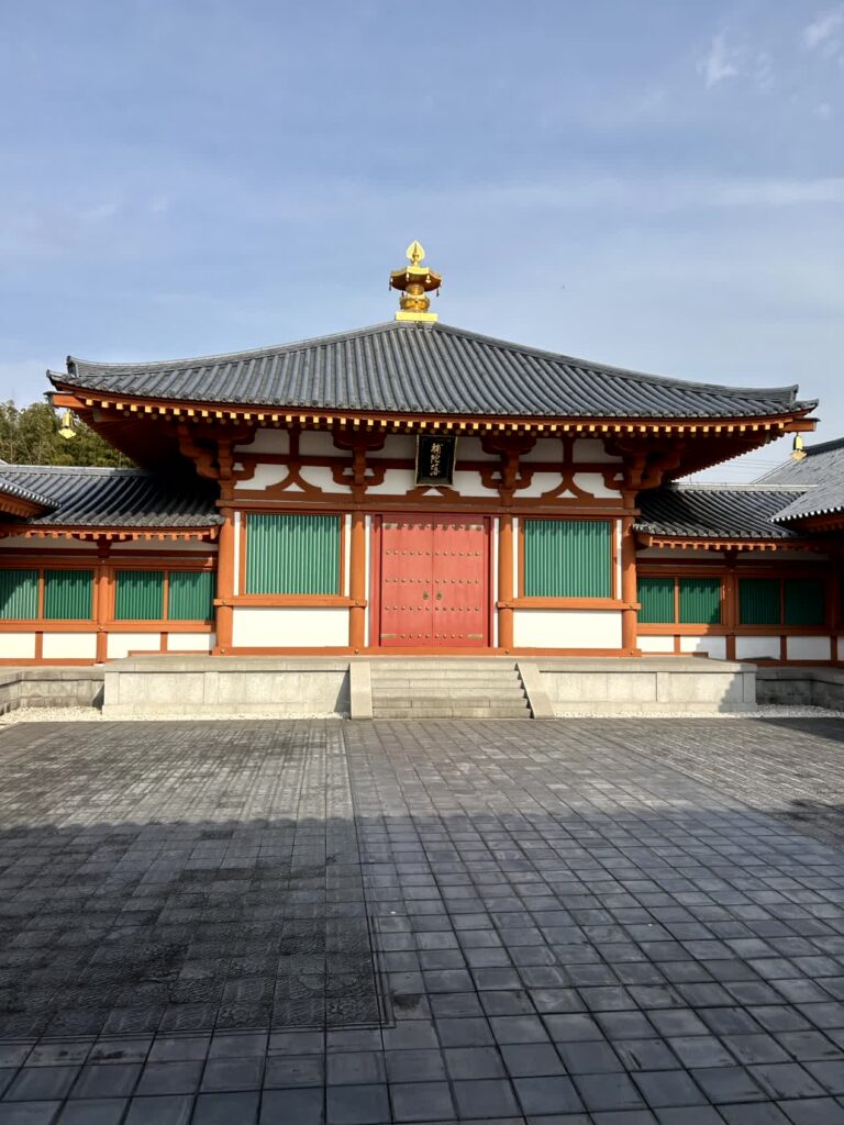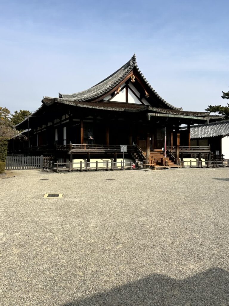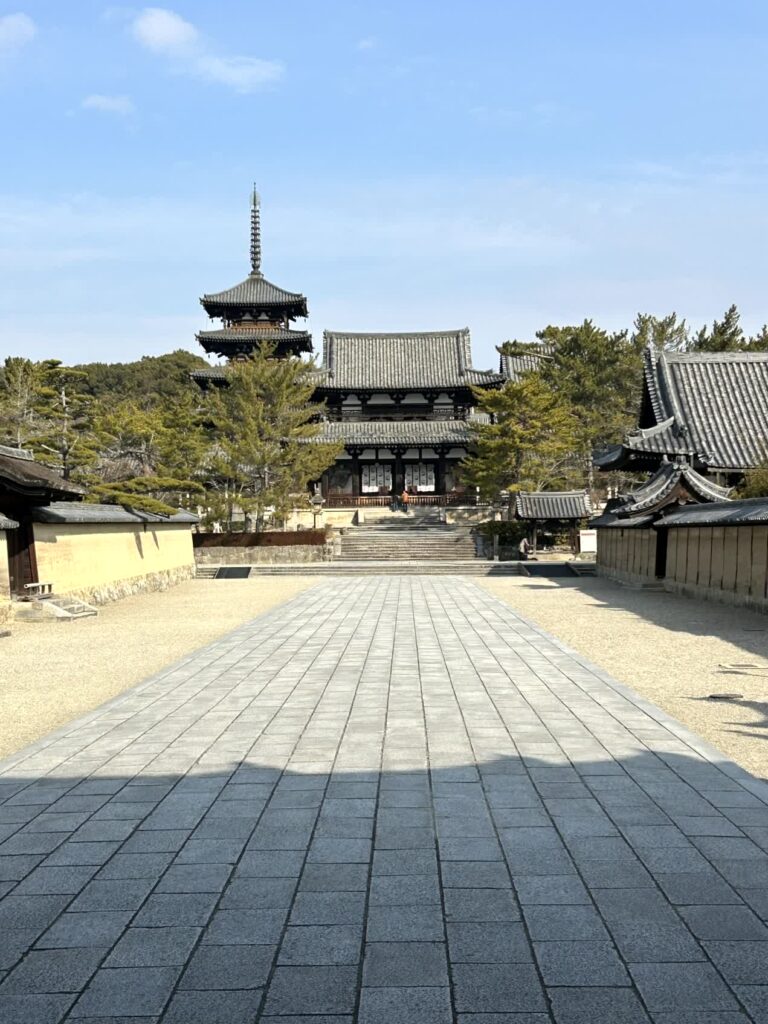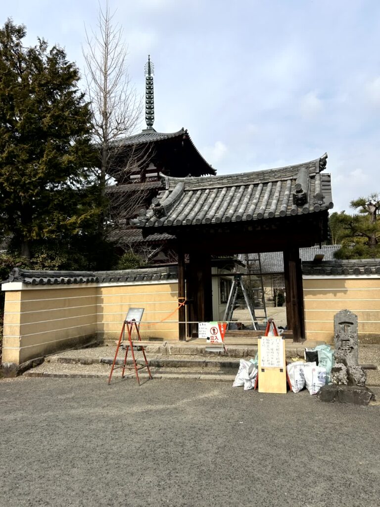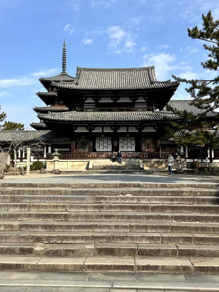 次は法輪寺です。ここの創建は飛鳥時代に遡り、聖徳太子の長子である山背大兄王が、聖徳太子の病気平癒を願って建立したと伝えられています。かつて国宝であった三重塔は落雷で消失しましたが、1975年に創建当初の様式で再健されています。講堂は本来は僧が勉強するための建物ですが、1960年に耐火・耐震の収蔵庫として改築されています。その講堂で、保管、保存されている仏像を見学します。