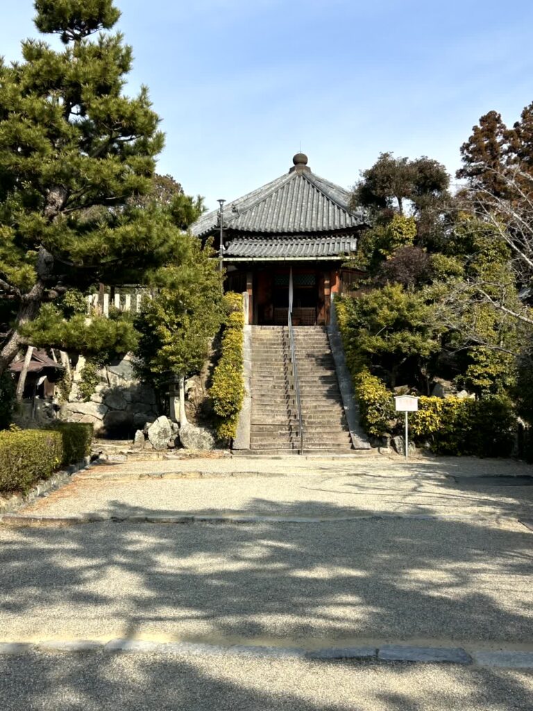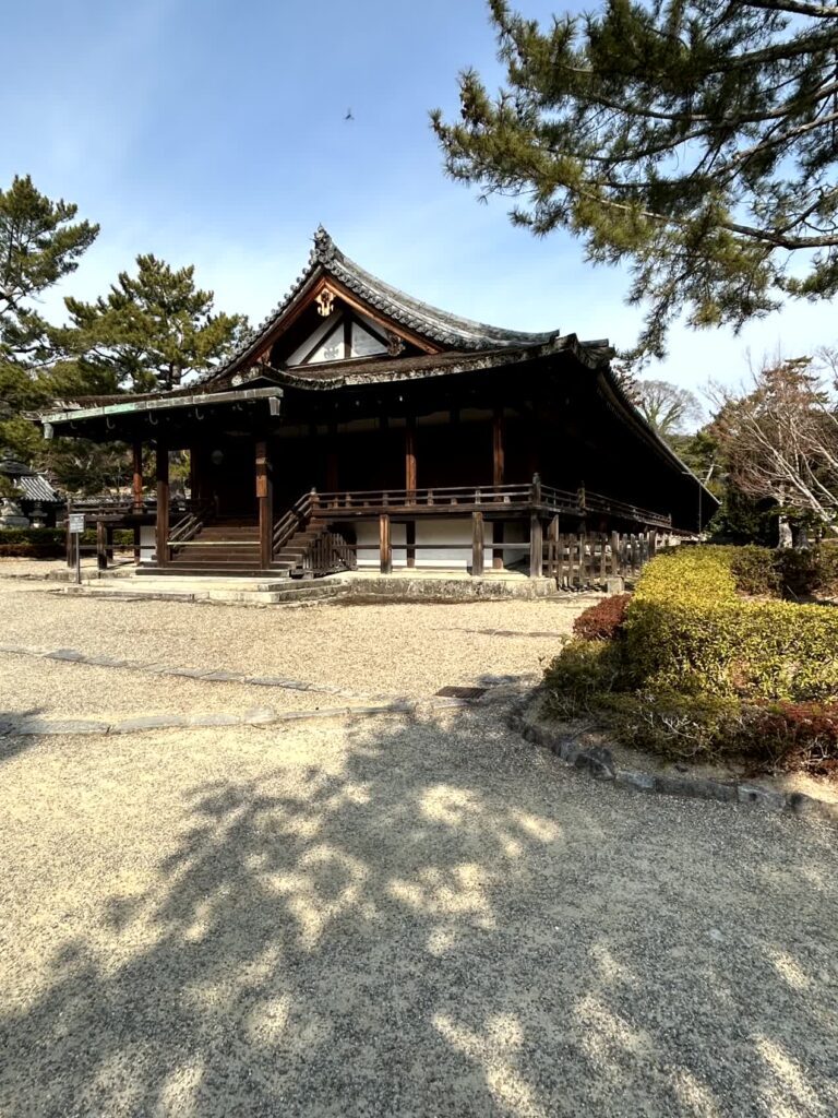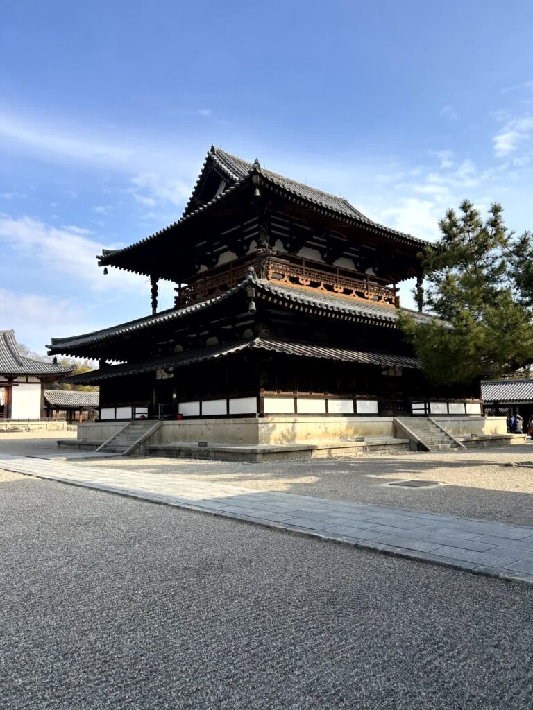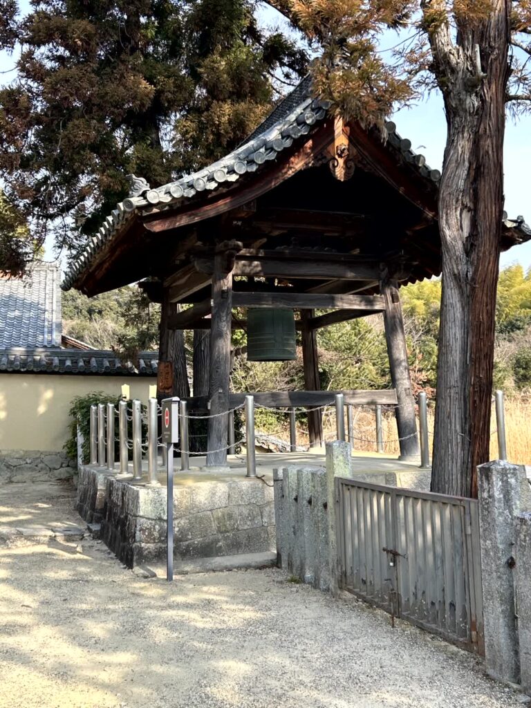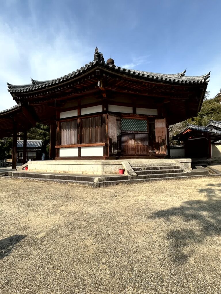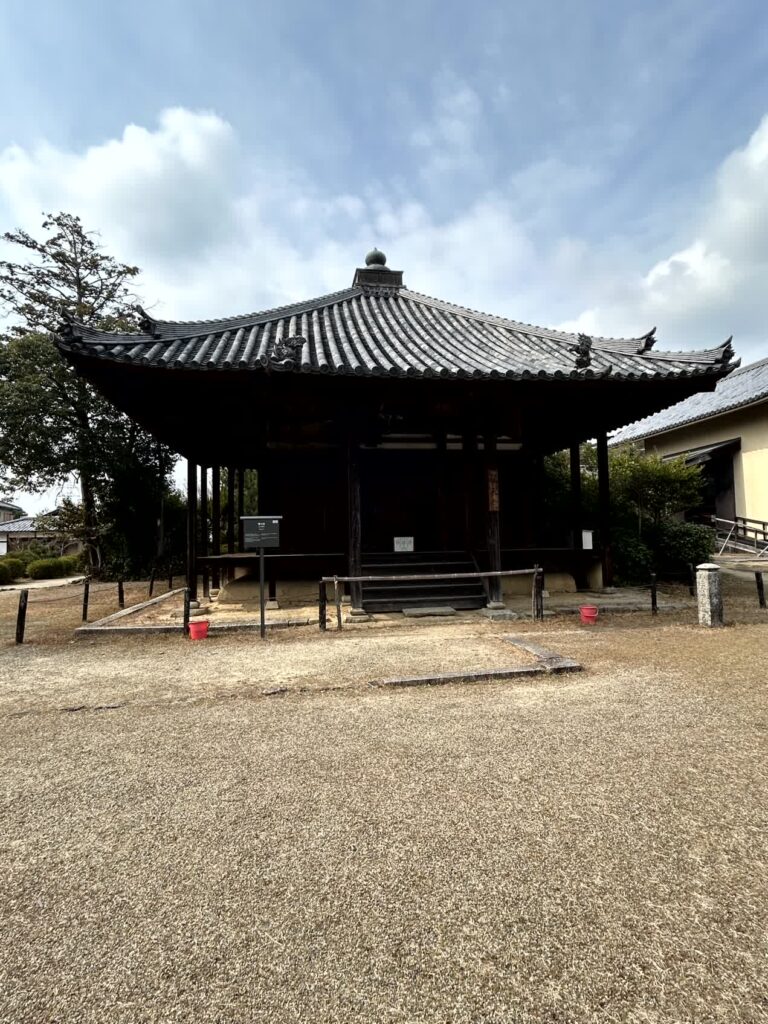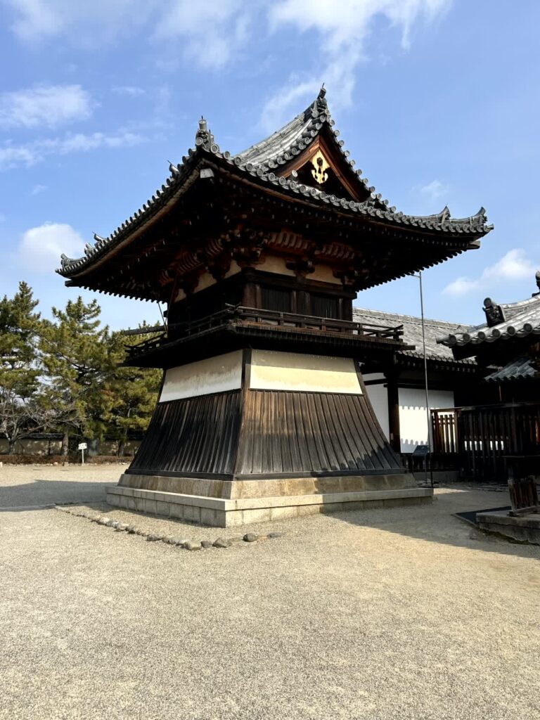 西院伽藍を出て、その西側にある西円堂(さいえんどう)に向かいます。途中には国宝の三経院・西室(僧が生活をするための僧坊)があります。西円堂は、夢殿と同じ八角円堂形式で、中には国宝の薬師如来像が収められています。また西円堂は、境内の小高い所にあるため、そこからは西院伽藍が一望出来ます。西円堂の脇に、時の鐘として使われている鐘楼があります。訪れた時、丁度、鐘が突かれていました。この音を聞いて、正岡子規はあの有名な俳句を考えたのでしょうか。