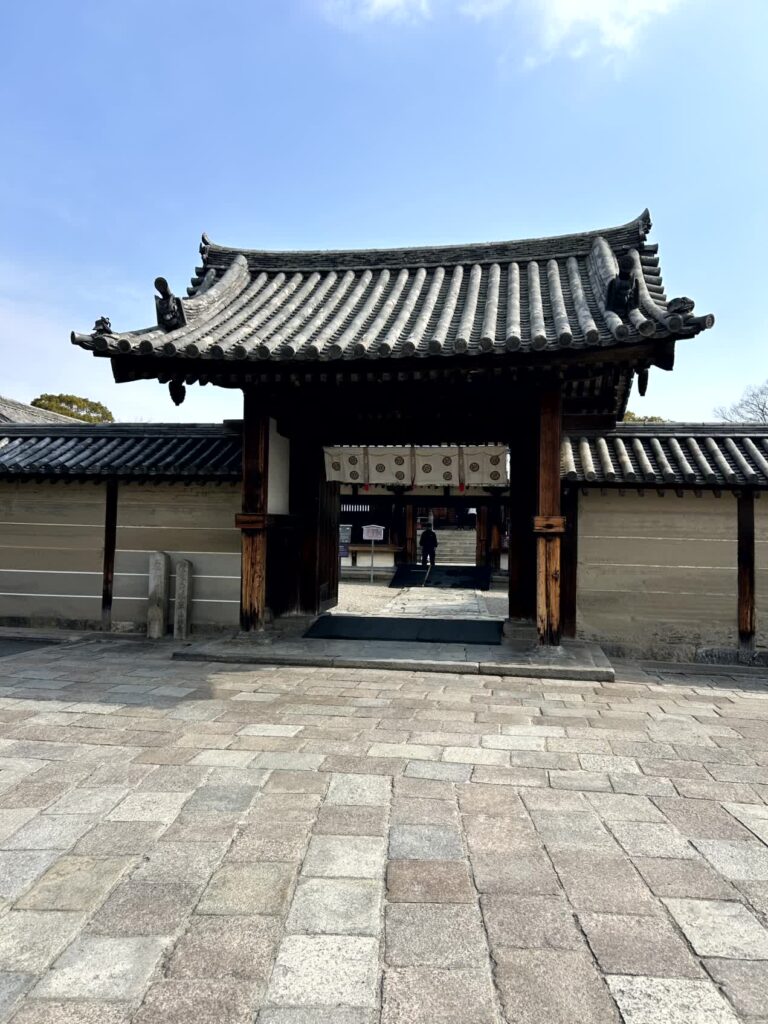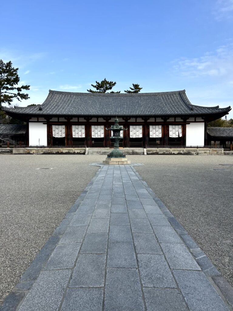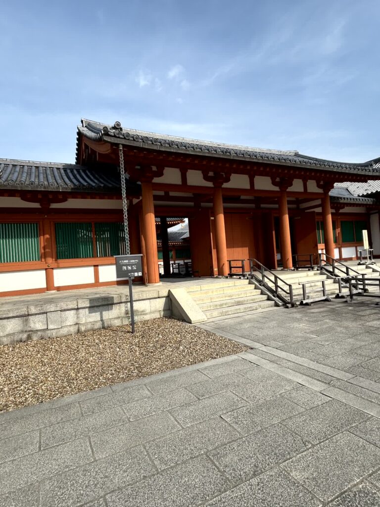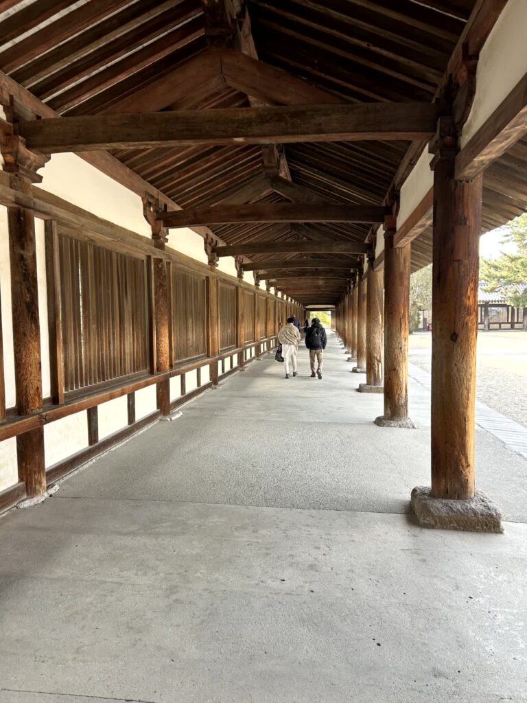 次は、国宝の聖霊院・東室(西室と同じく僧坊)を過ぎ、西院伽藍の東側にある大宝蔵院に向かいます。ここには、百済観音像が安置されている百済観音堂を中心に、東西に宝蔵が置かれ、法隆寺に伝来する数々の名宝が展示・保管されています。大宝蔵院を見学した後、西院と東院の境に建っている東大門(中ノ門)をくぐり、東院伽藍に入り、夢殿に向かいます。