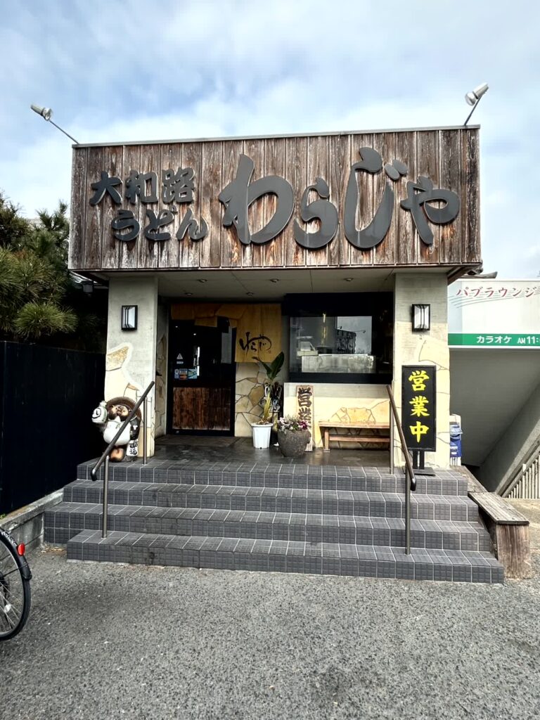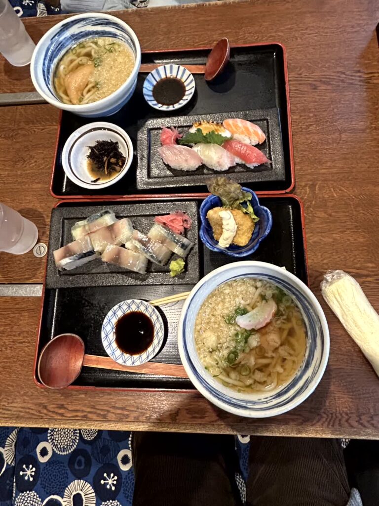昼食時となりました。サイクリングロードを、法隆寺と反対の方向に進み、「大和路うどんわらじや」に入ります。にぎり盛り定食とさば押し寿司定食を頂きました。