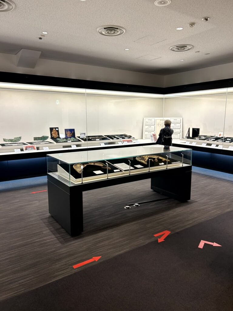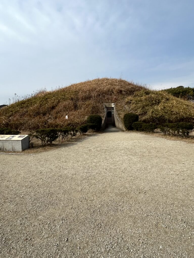 昼食後、まだ時間がありましたので、法隆寺とは反対側、龍田川に向かいます。途中、藤ノ木古墳、藤ノ木古墳に関する展示が見られる斑鳩文化財センターに立ち寄ります。藤ノ木古墳は6世紀後半に作られた50mの円墳です。未盗掘の石棺からは、二体の被葬者と世界でも類を見ない豪華な馬具や副葬品が出土しています。それらはセンター内で展示されています。センターの外には、朱色に塗られた藤ノ木古墳石棺の実物大レプリカがありました。