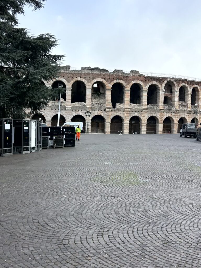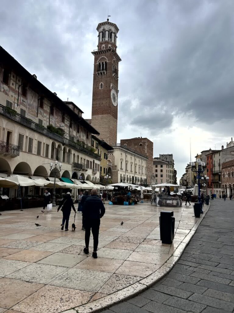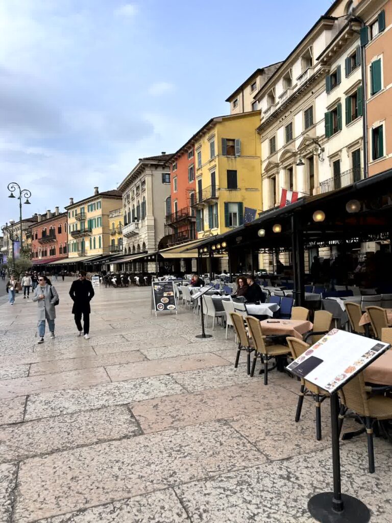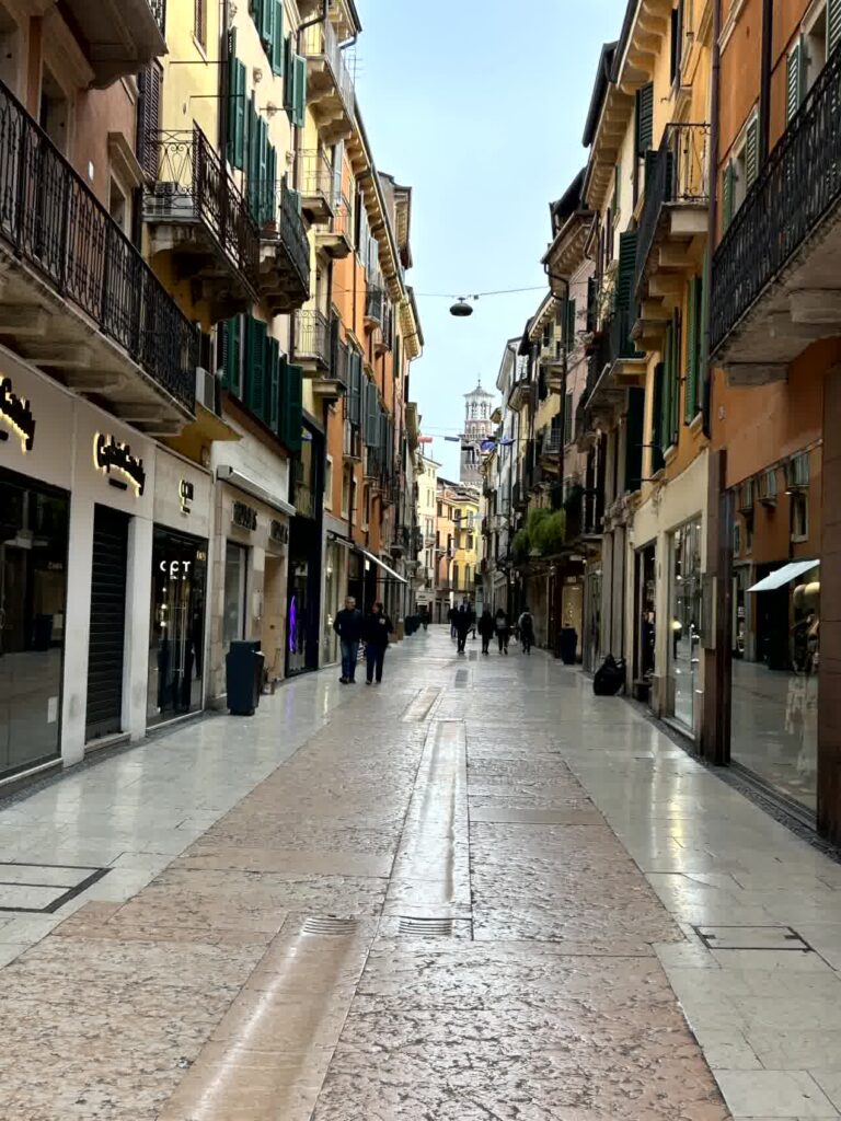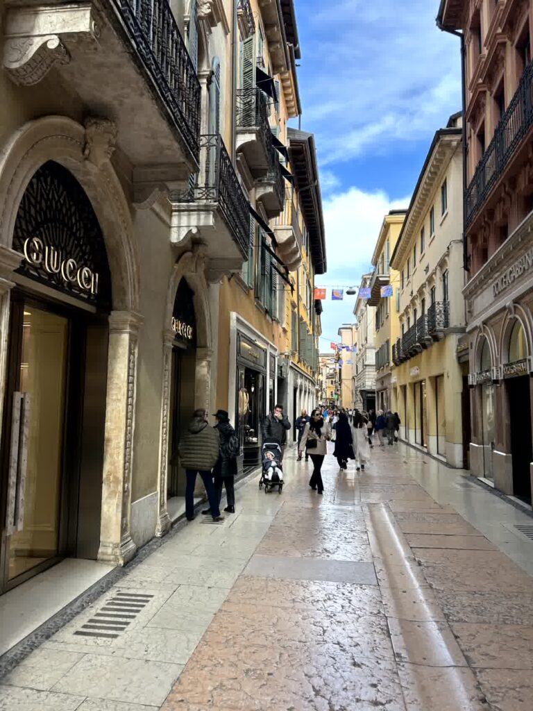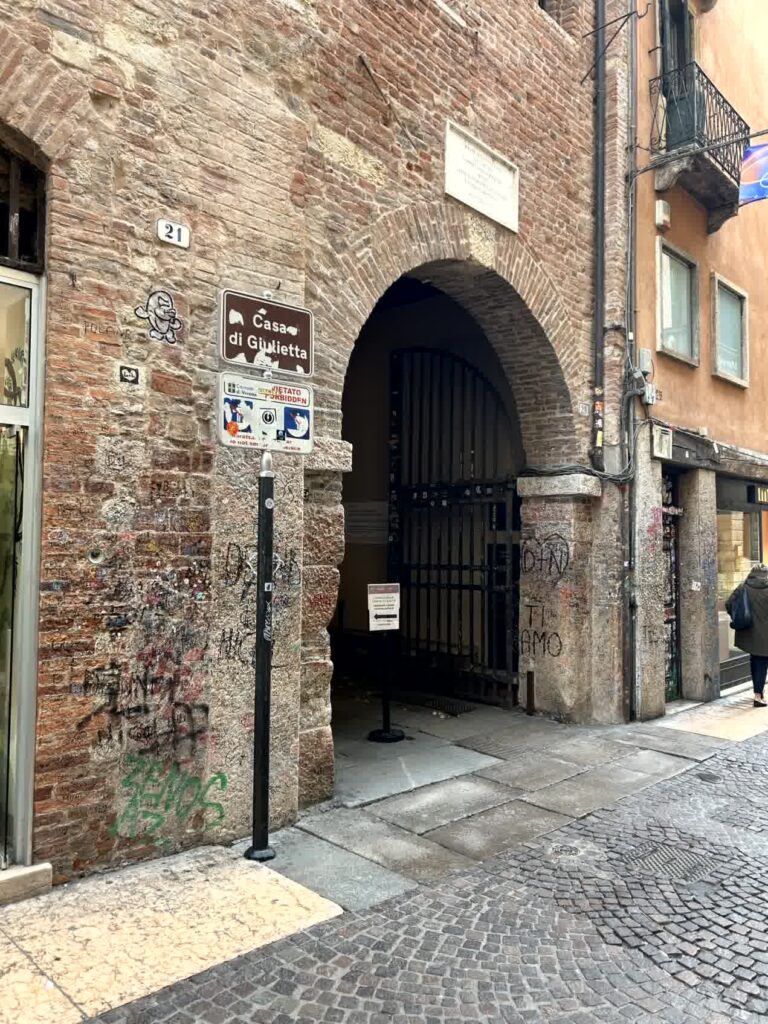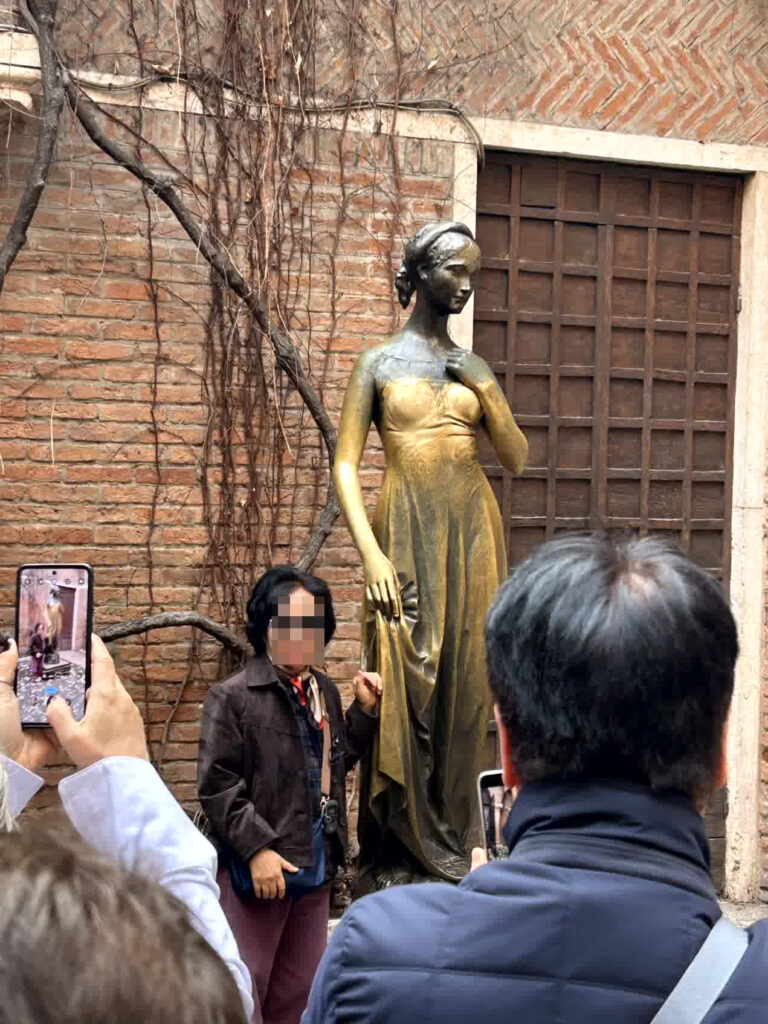 今日は、小雨がぱらつくあいにくの天気ですが、本格的な雨にはならないようです。列車はミラノ中央駅を7時45分に出発し、ヴェローナ駅には9時に到着しました。駅前からバスに乗り、街の中心部にあるアレーナでおります。アレーナは、オリンピック開催に合わせ、改修工事ということで、残念ながら見学はできません。その周りは、ベラ広場ですが、まだ朝が早いので、観光客は少ないです。ブランドショップが立ち並ぶジュゼッペ・マッジーニ通りを抜け、ロミオとジュリエッタのヒロイン、ジュリエッタの家に向かいます。