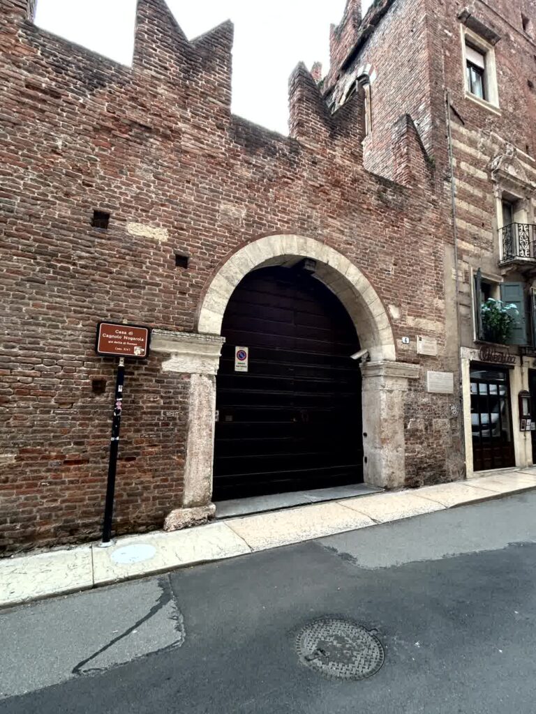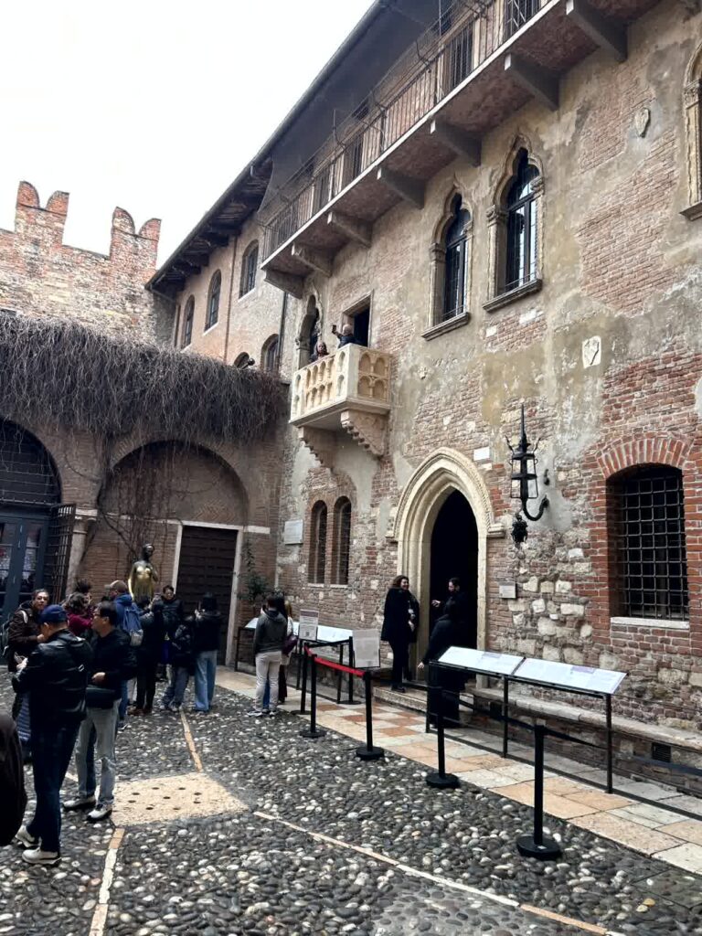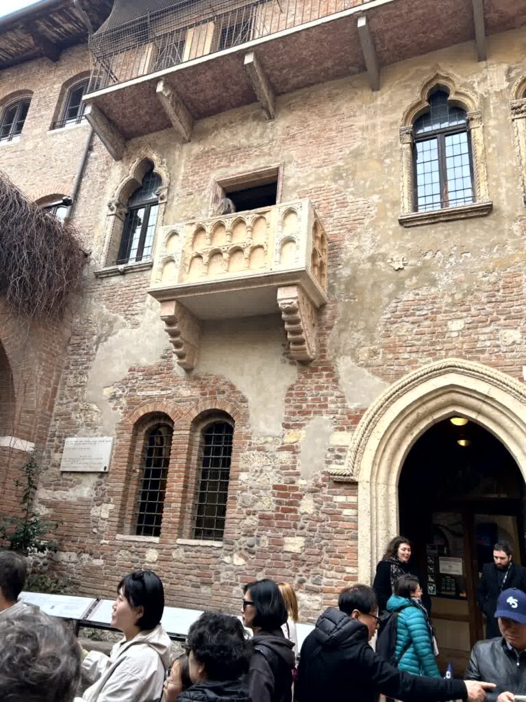 通りを左にまがり、50mほど進むと左側にジュリエッタの家という看板がありますので、そこから中に入ります。入るとすぐに、これまでテレビ等で何回も見たジュリエッタの家の風景が飛び込んできます。バルコニーには、人影が有りますが、家への入場は予約が必要で、今日は予約していません。外から見るだけです。ジュリエッタの像の前には、大勢写真を撮る人がいます。
