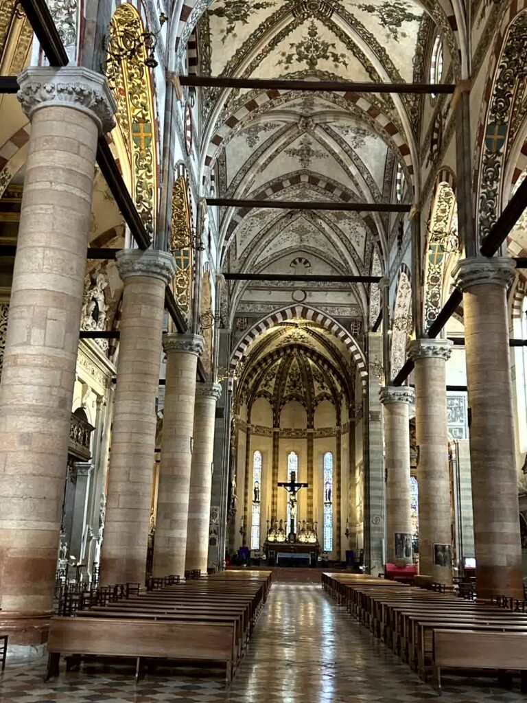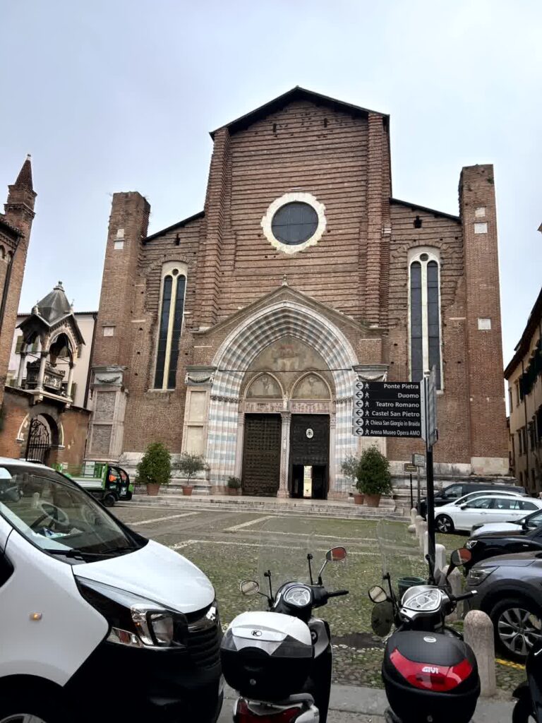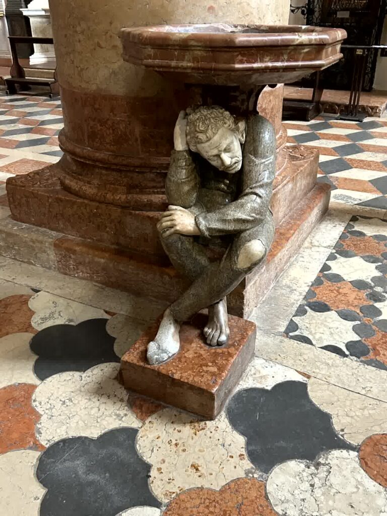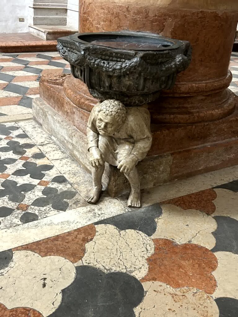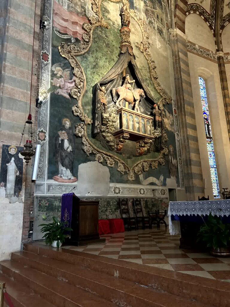 そこから100m位のところにロミオの家がありますが、観光客は誰もいませんでした。この近くには、せむし男で有名な、ヴェローナで最も大きいサンタ・アナスタージア教会が有りますので、行ってみます。入口から入ると直ぐに、左右の柱の聖水盤の下にせむし男がいます。これらには「キリスト教的な人間の苦痛を表現している」とか「教会に入る前に身をかがめて謙虚になれ」とか、色々な考え方があります。この教会のパンフレットには、せむし男に触れると、幸運がやってくる、と書かれてあります。主祭壇の左側には、14世紀中頃に制作された彫刻と絵画を組み合わせたコルテシア セレゴの記念碑というレリーフのような作品があります。中央で鎧を着て馬に乗っているのがコルテシアです。