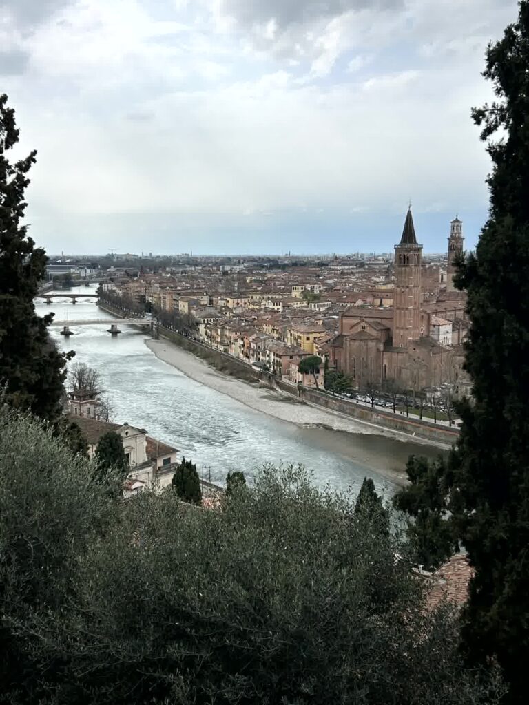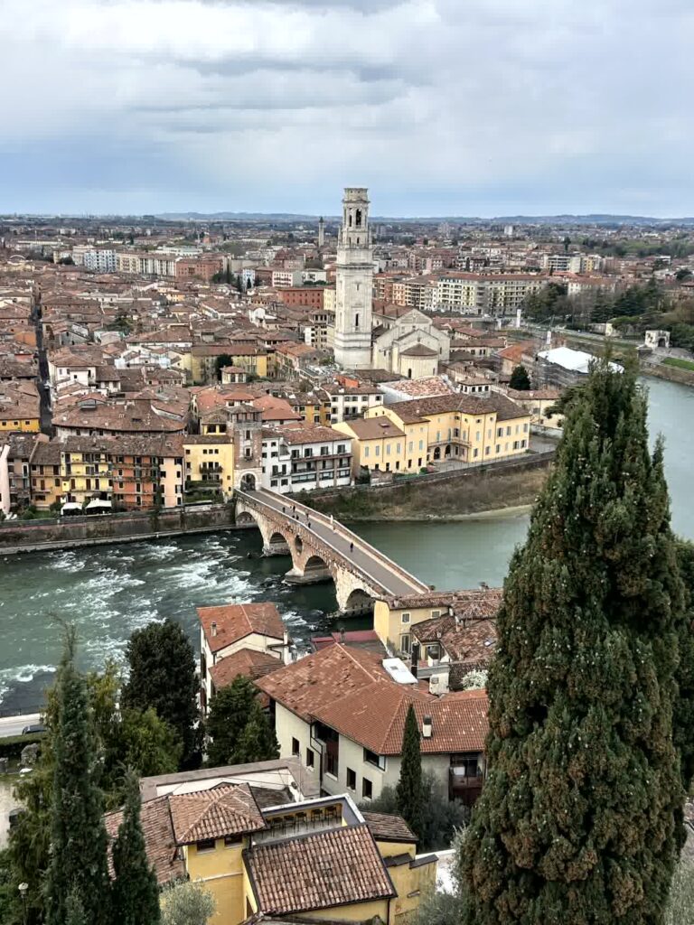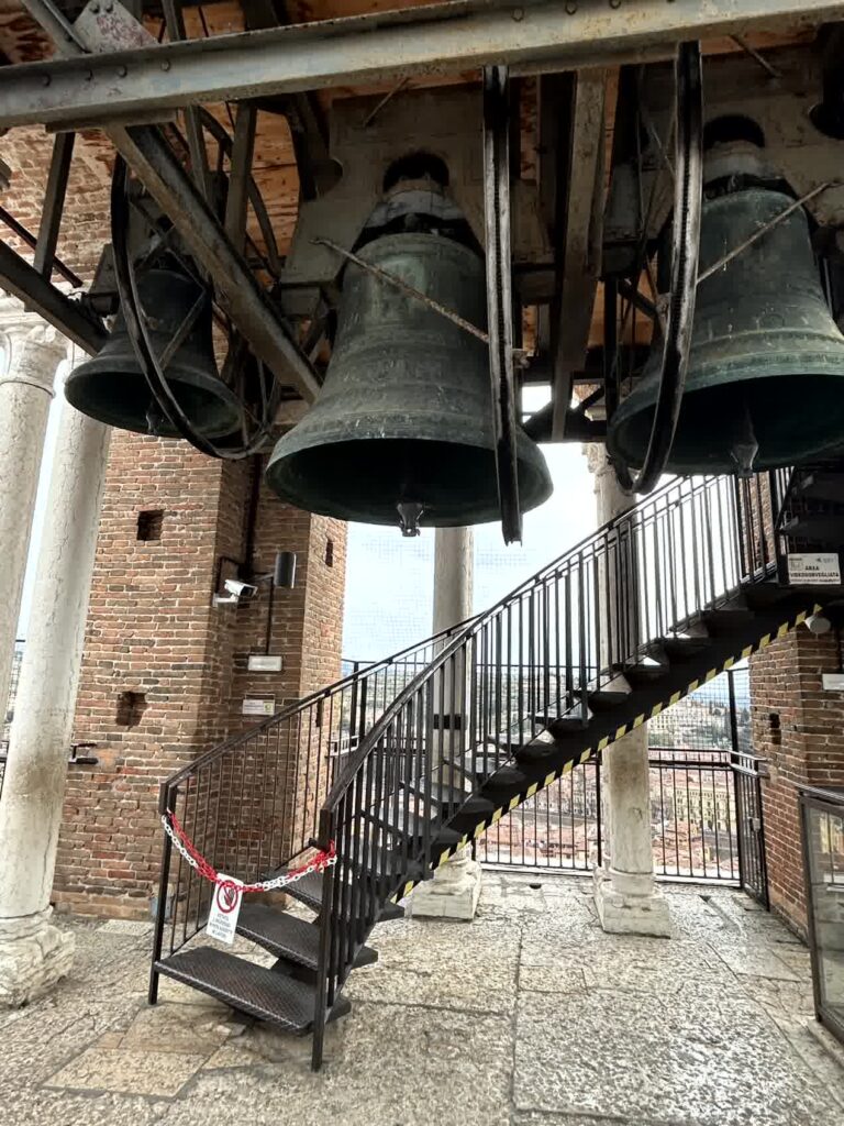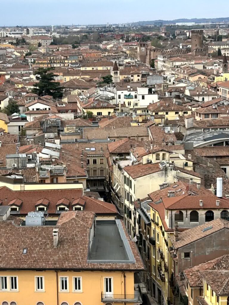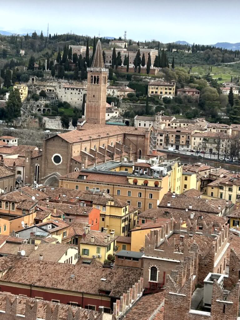市や飲食店が多くあるエルベ広場に立つ、ランベルティの塔に登ることにします。この塔にはエレベーターが有りますので、さくっと上に登れます。塔の上からは、ヴェローナ全体が見渡せます。先ほど見てきたサンタ・アナスタージア教会や、アディジェ川の向こうの小高い丘には、これから行くサン・ピエトロ城跡も見えます。