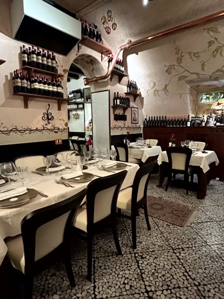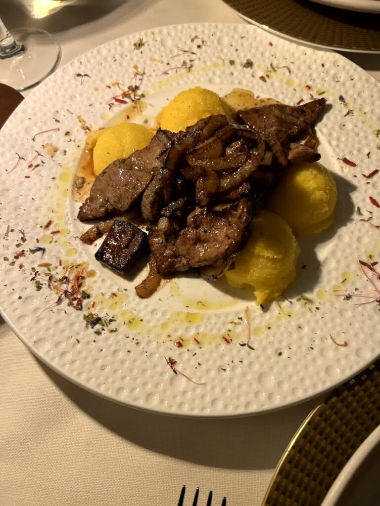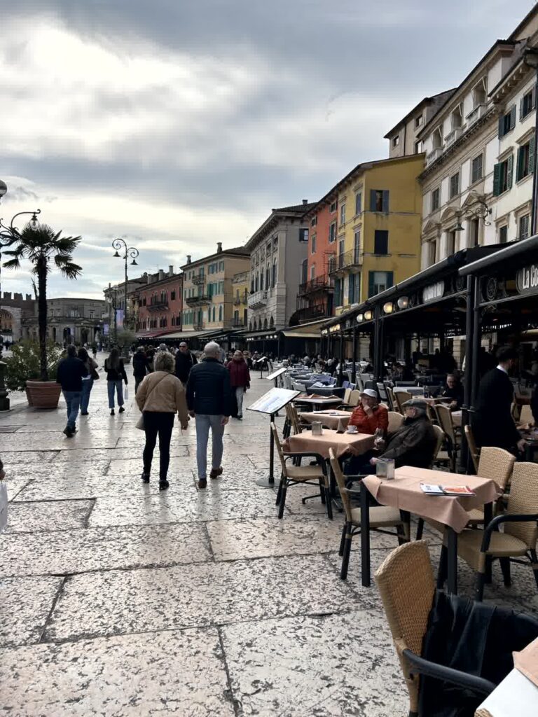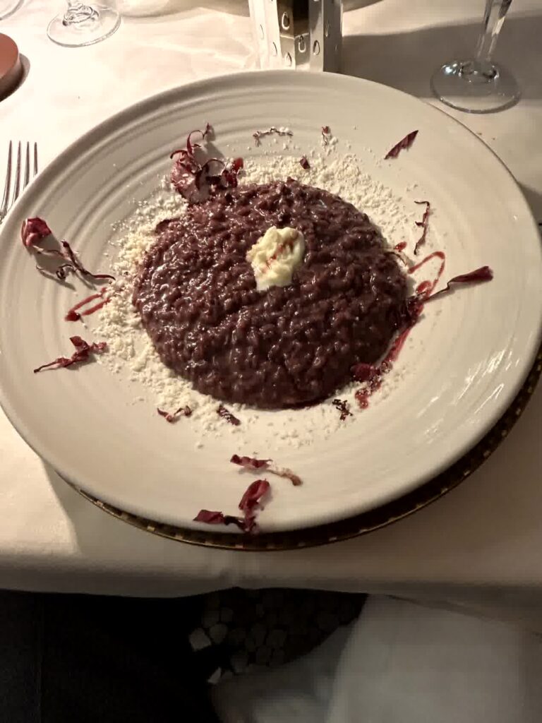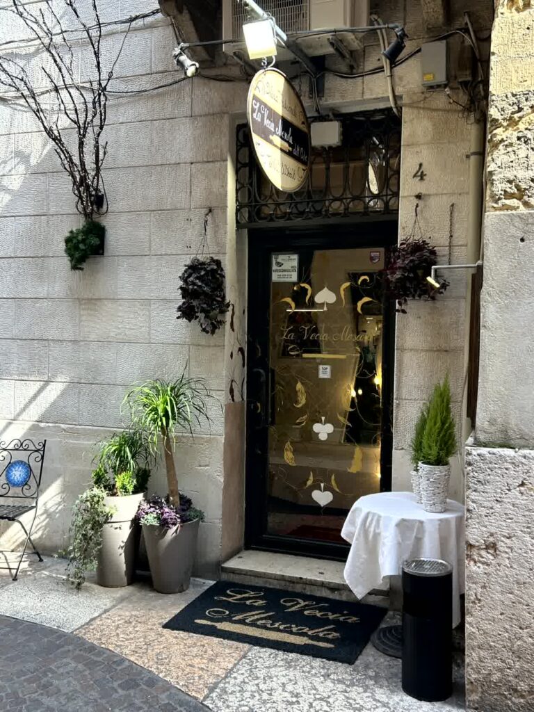 昼食時となりました。例によって、「評判の良い店」ということでAIに聞きました。その中から、ヴェローナのワインを使って煮込むリゾットアマローネと、トウモロコシの粉で作るポレンタが食べられそうな「La Vecia Mescola」に入ることにしました。一番乗りでしたので、客はまだいません。店内は、雰囲気の良い店です。リゾットアマローネは2人前からとのことなので、2人前を頂き、ポレンタが添えられている子牛のレバーの煮込みもお願いしました。プラス、ワインと炭酸水。アマローネリゾットは見た目もそうですが、私には小豆で煮たような「おかゆの味」がしました。子牛のレバーは想像通りの味でしたが、ポレンタは、見た目では甘く見えますが、全く味がしないのにビックリしました。ヴェローナでは、良い食事の体験ができました。
