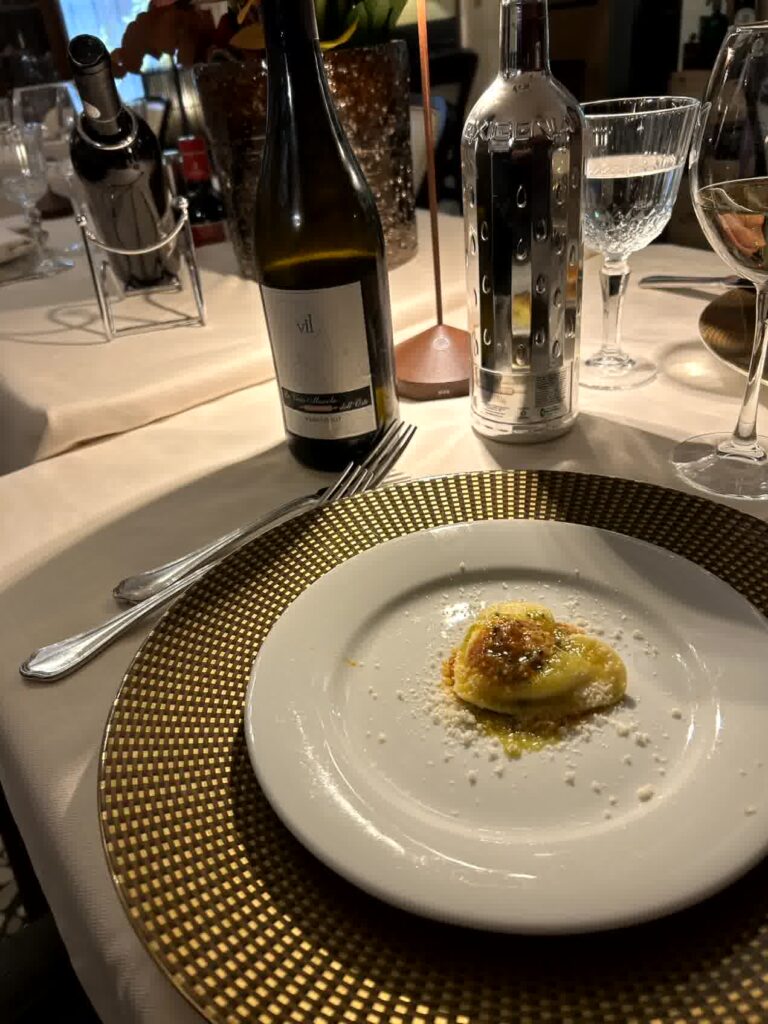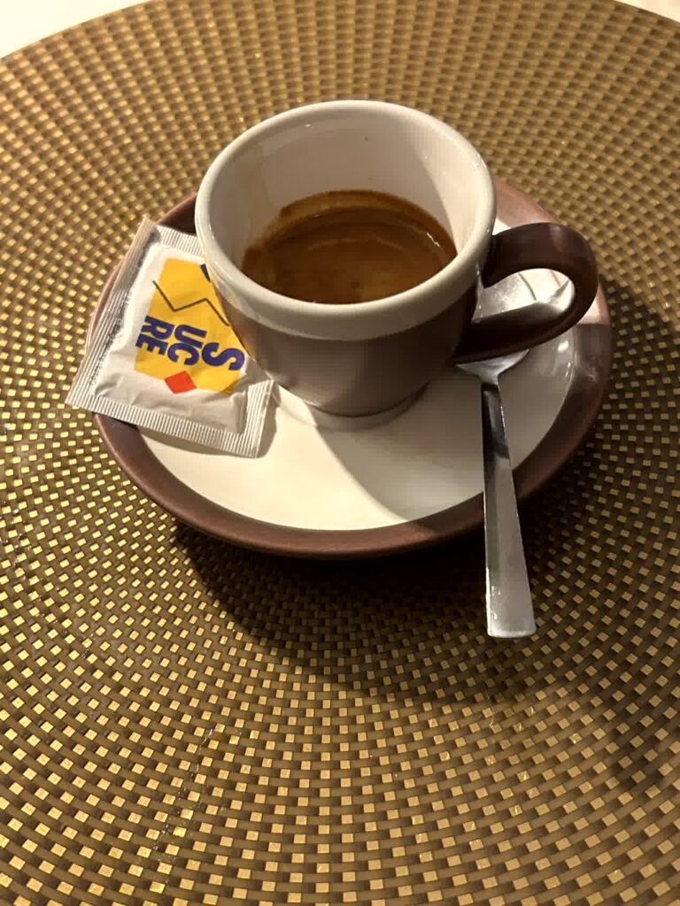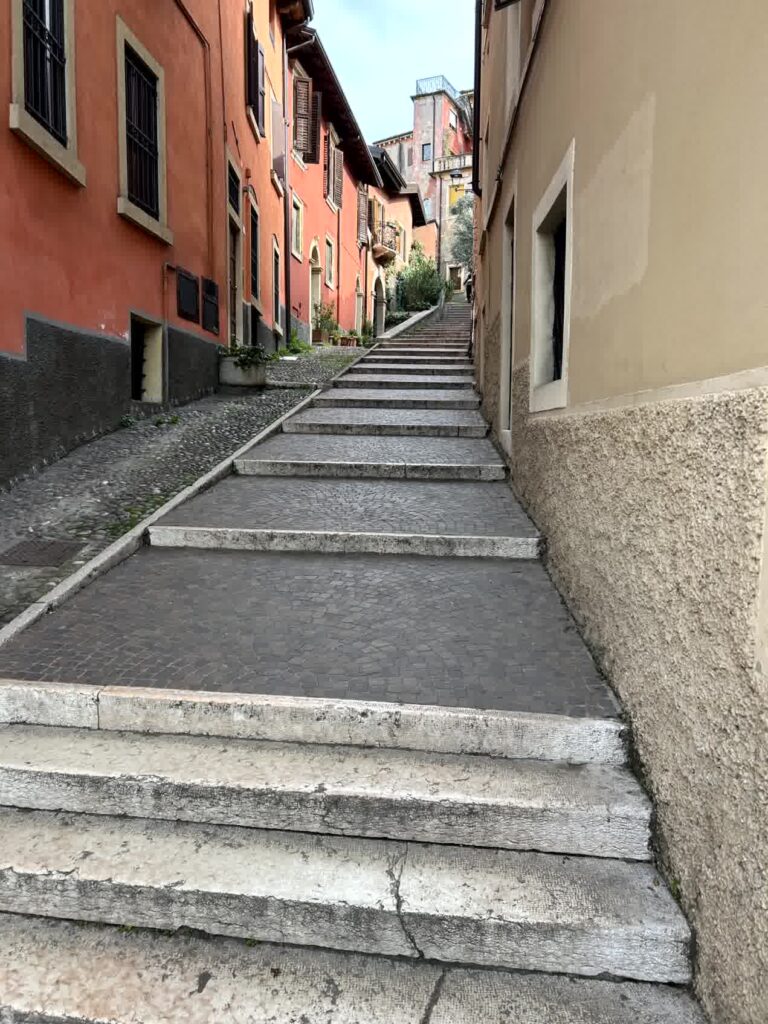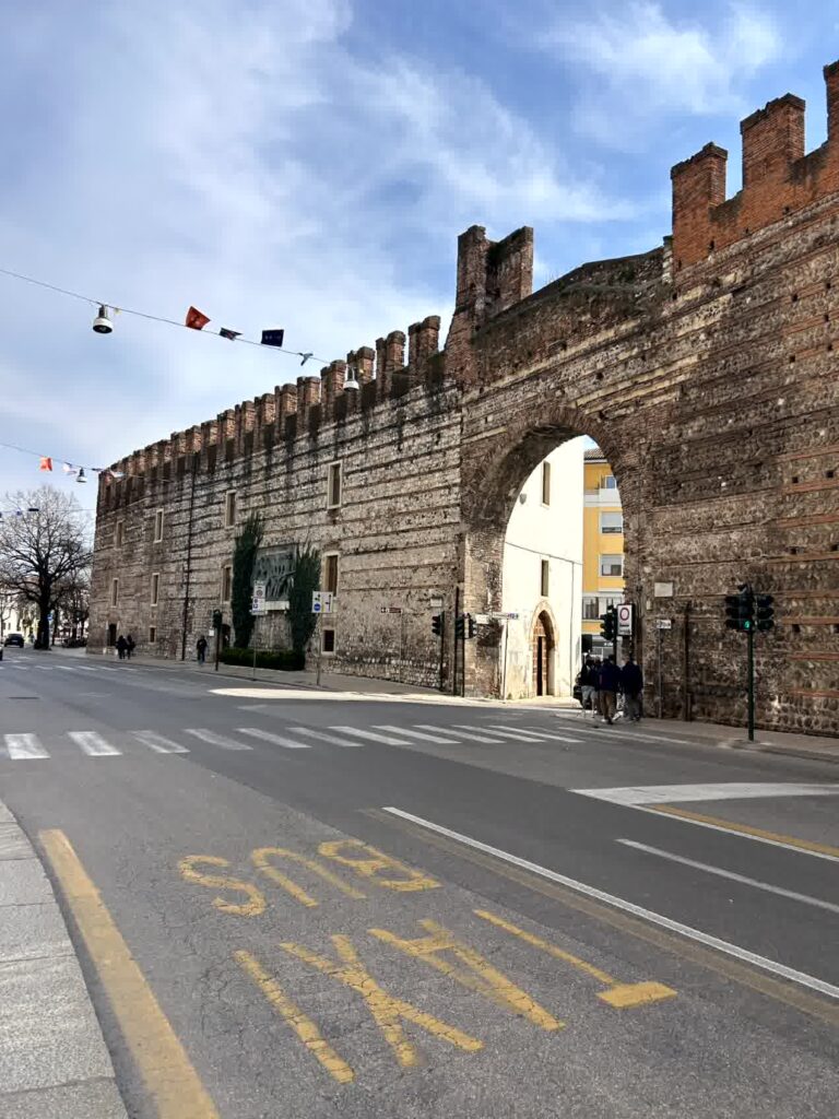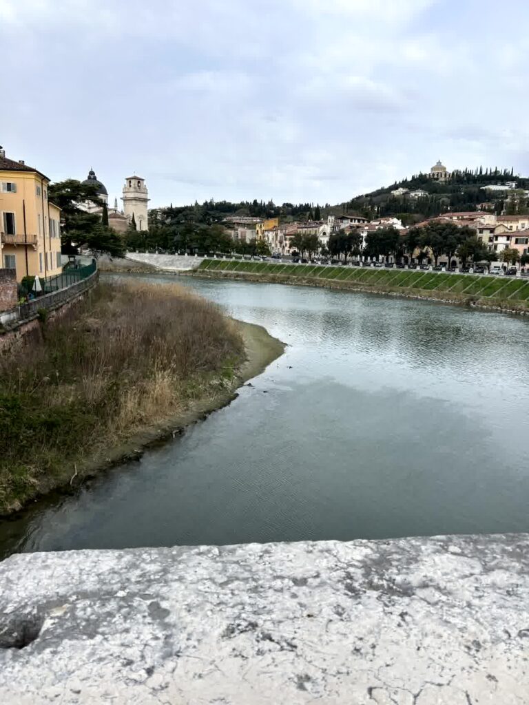 昼食時となりました。例によって、「評判の良い店」ということでAIに聞きました。その中から、ヴェローナのワインを使って煮込むリゾットアマローネと、トウモロコシの粉で作るポレンタが食べられそうな「La Vecia Mescola」に入ることにしました。一番乗りでしたので、客はまだいません。店内は、雰囲気の良い店です。リゾットアマローネは2人前からとのことなので、2人前を頂き、ポレンタが添えられている子牛のレバーの煮込みもお願いしました。プラス、ワインと炭酸水。アマローネリゾットは見た目もそうですが、私には小豆で煮たような「おかゆの味」がしました。子牛のレバーは想像通りの味でしたが、ポレンタは、見た目では甘く見えますが、全く味がしないのにビックリしました。ヴェローナでは、良い食事の体験ができました。