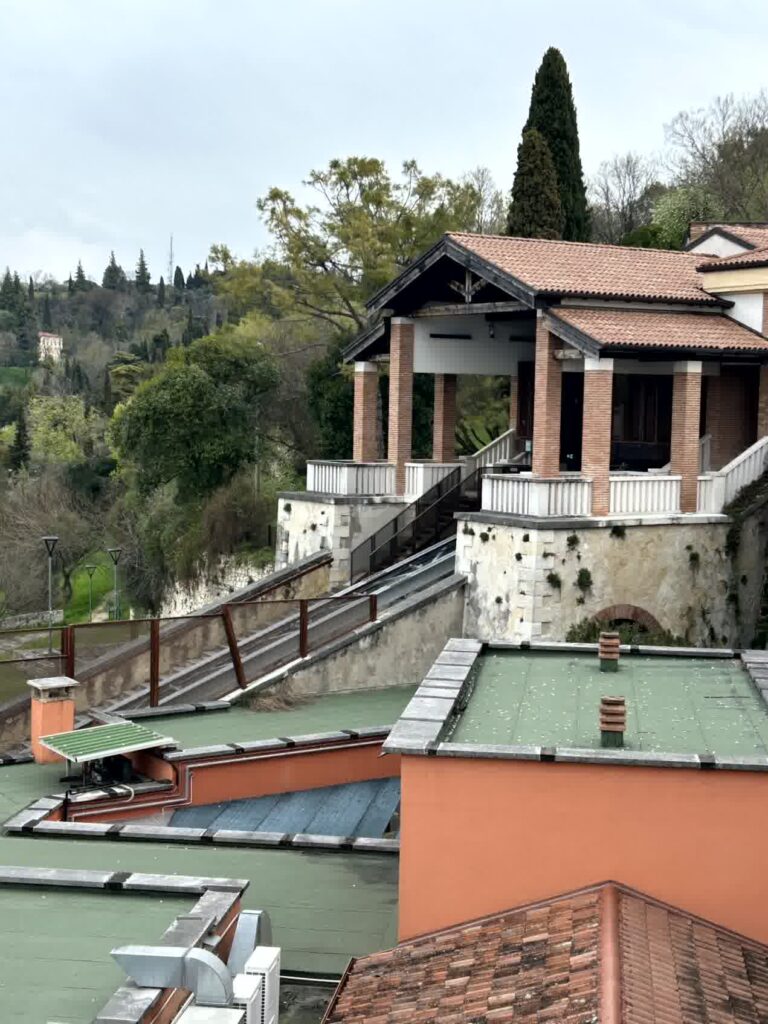 街の中心から、アディジェ川に架かる橋を渡り、サン・ピエトロ城跡を目指し、丘の坂道をひたすら10分程上ります。途中、林の陰からは、ヴェローナの美しい光景が、時々見えてきます。サン・ピエトロ城跡に到着し、下を見ると、期待にたがわぬ美しい光景が見えます。ところが、城跡の先を見ると、なんとケーブルカーの駅があります!ケーブルカーがあるとは知りませんでした。ですが、帰りも坂道を歩いて戻ります。
