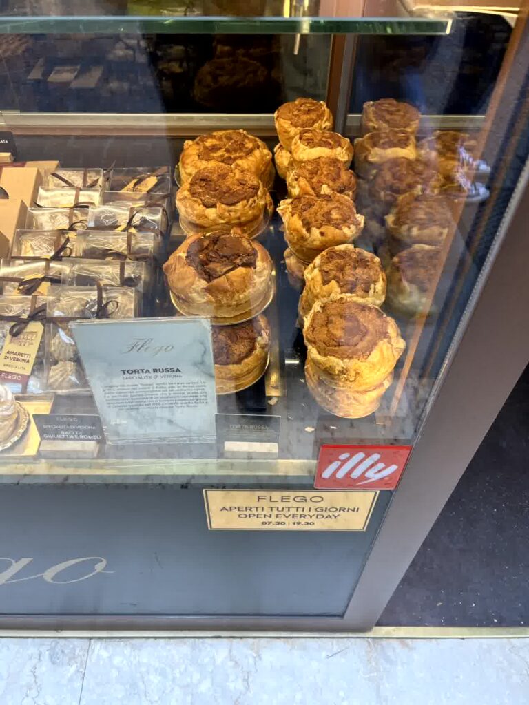 列車の時間も近づいてきましたので、歩いてヴェローナ駅に向かいます。街は「城壁」で囲まれています。ヴェローナは古来から交通の要衝で、外敵からの脅威に常にさらされているので、こうなったようです。来たときと逆に、ジュゼッペ・マッジーニ通り、ベラ広場と通ります。通りの菓子屋に、トルタ・ルッサが売られています。「ロシアのケーキ」という意味で、大きく、背が高くふわふわ、ナッツのような香りが漂うケーキのようです。これも買えば良かったです。ヴェローナからは、16時の列車に乗り、17時15分にミラノ中央駅に戻りました。