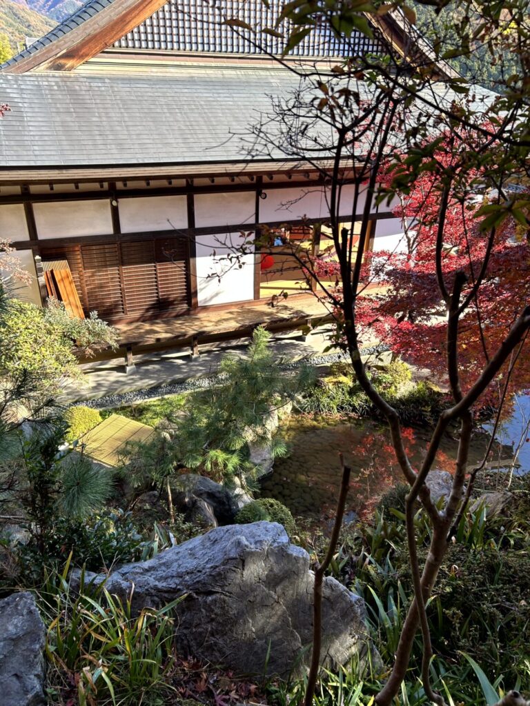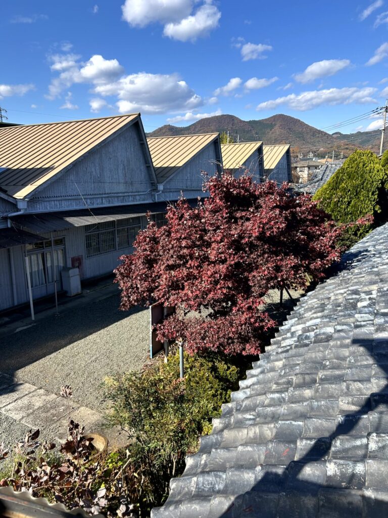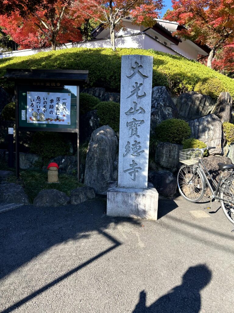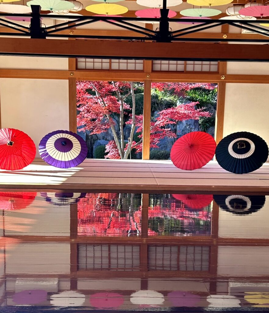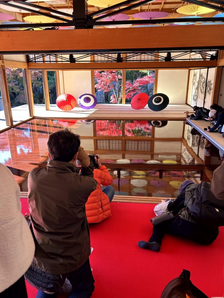 今日一番は、「床もみじ」で有名な法徳寺に行くことにします。このお寺は、桐生地域の領主であった桐生正綱により、室町時代、1450年頃に創建された臨済宗建長寺派の禅寺です。本堂に入ると、鏡面状の床に、前方に見えるもみじと天井や前方にある傘が美しく映っています。床の周りには、写真を撮る参拝客が連なっています。今日は紅葉のベストタイミングです。