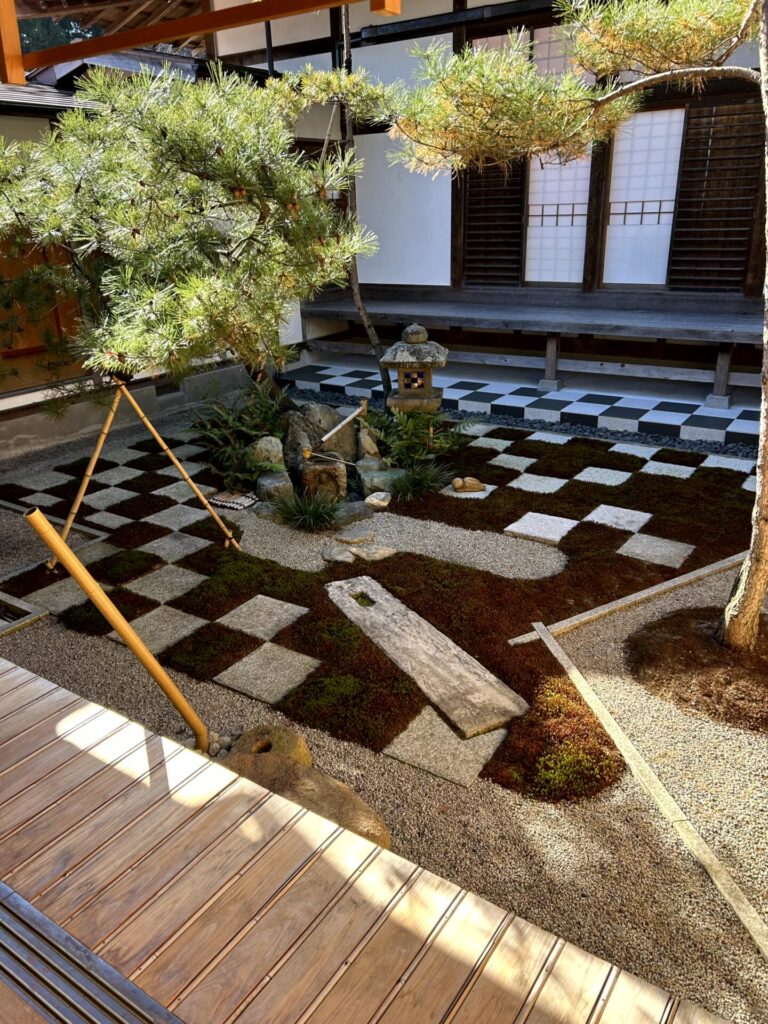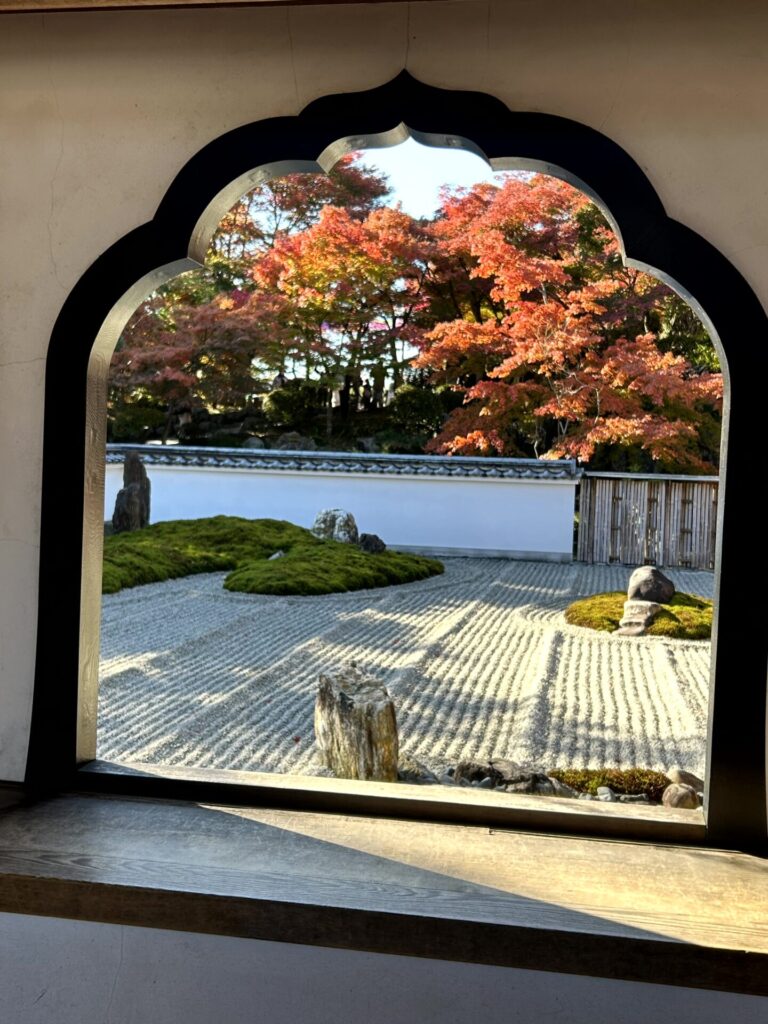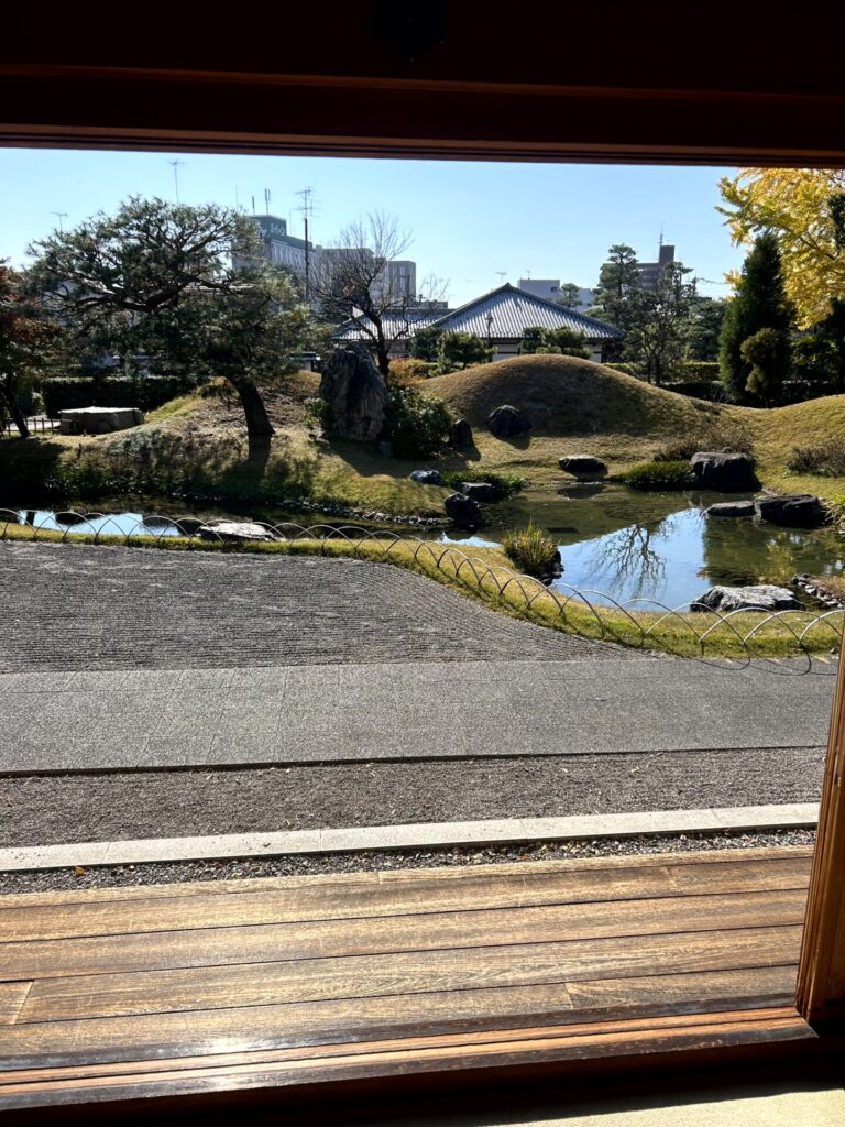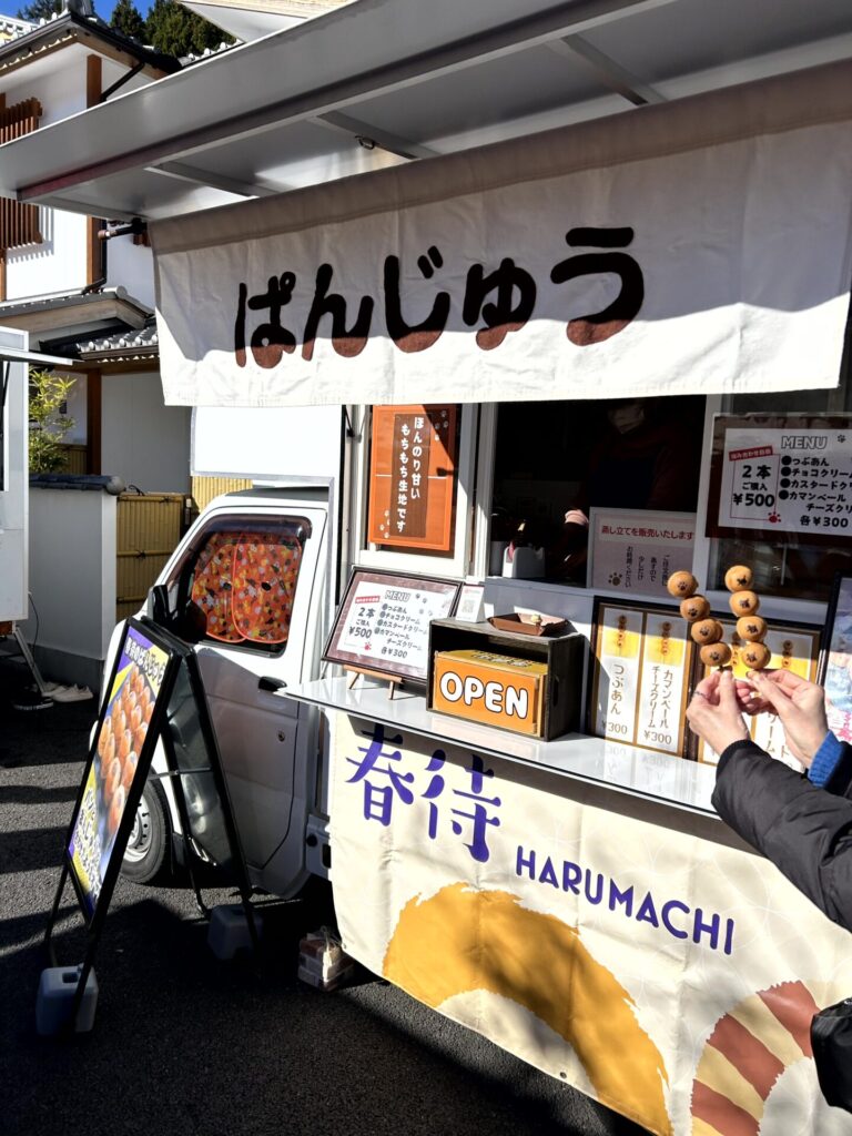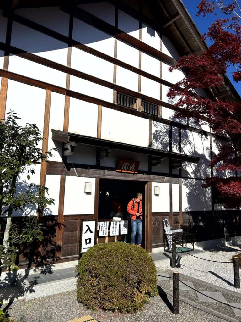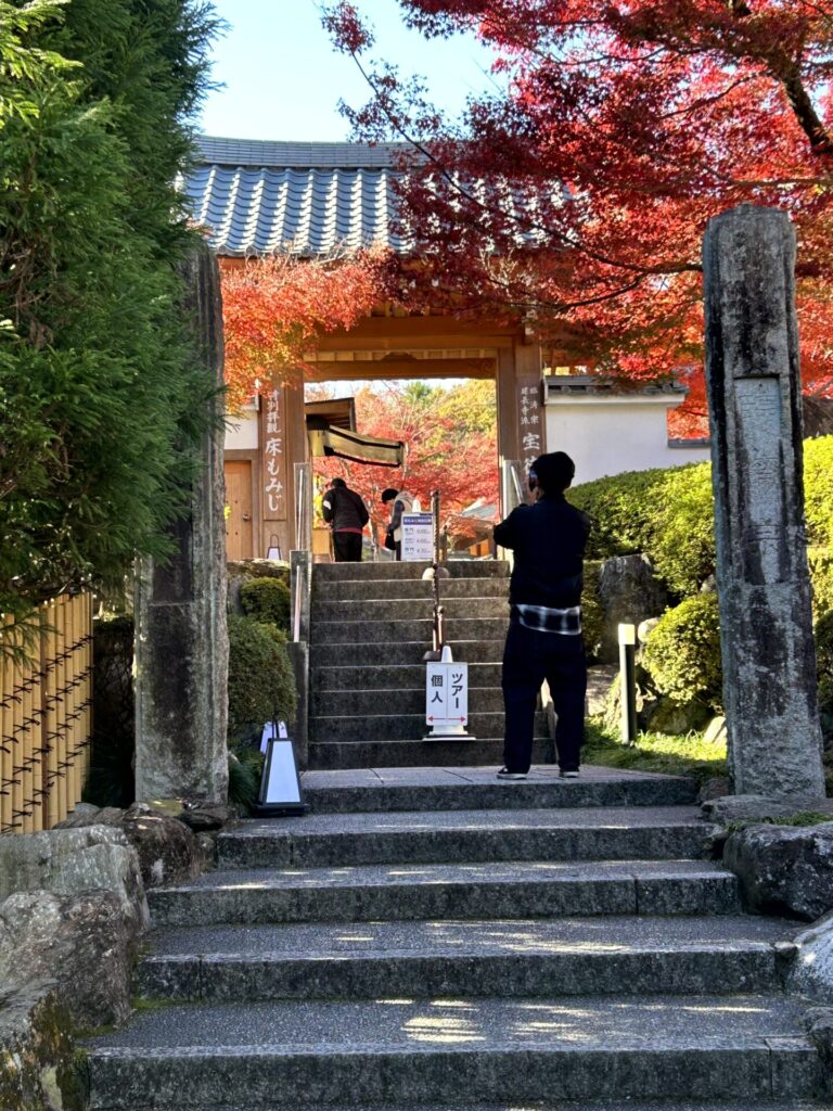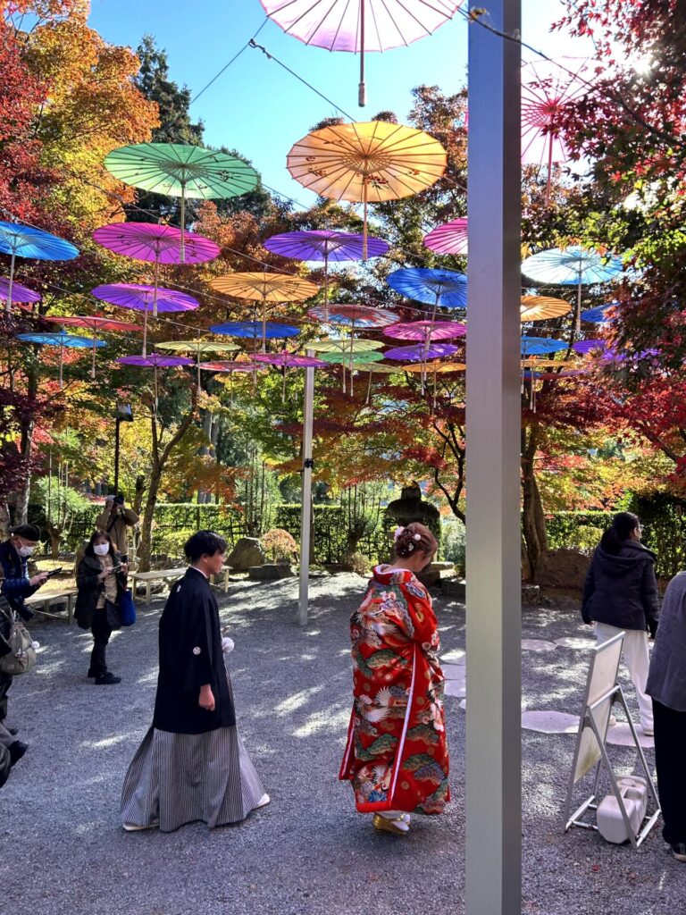 本堂からは、枯山水の庭や水琴窟がある富貴滴水の庭(市松模様はその柄が途切れることなく続いて行くことから、繁栄や継続、不変の意味が込められているそうです)も眺めることが出来ます。寺の外の庭も、もみじが丁度見頃で、新郎新婦が記念撮影しています。お寺のHPでは「ロケーションフォト」として大々的にPRしています。出口のキッチンカーで、この辺りの名物の「ぱんじゅう」が売られていましたので頂きました。