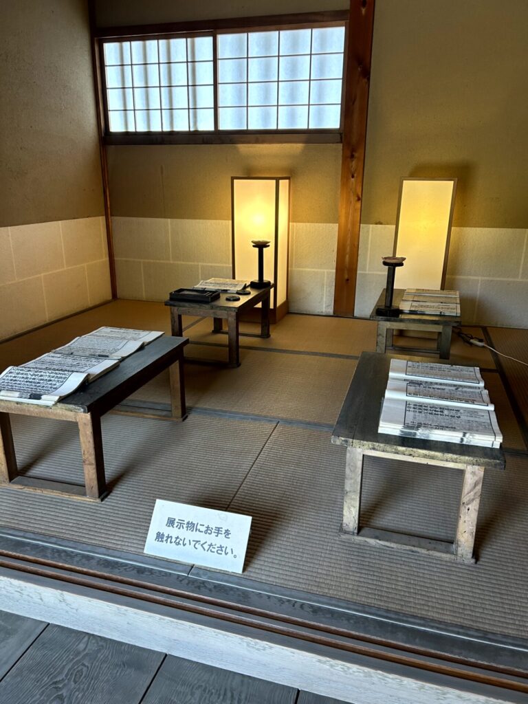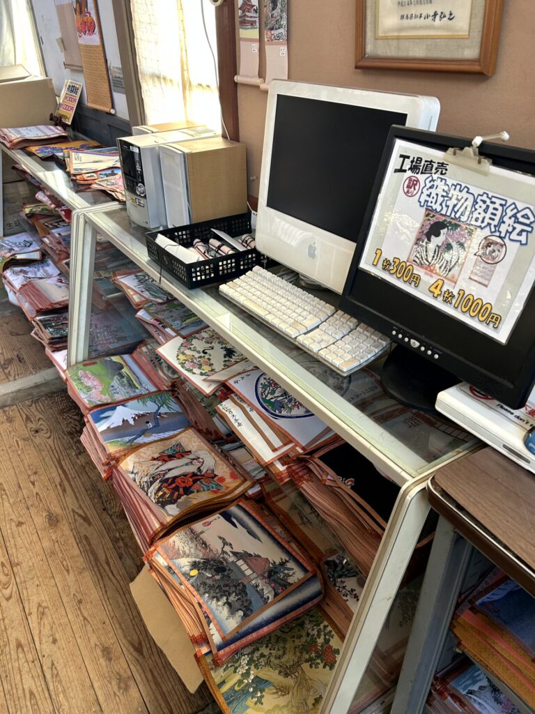 昼食後は、織物参考館紫(ゆかり)を見学します。ここには明治から昭和にかけての織物に関する資料が展示されています。現在もコンピュータージャカードを使用して、織物が織られています。織られた織物は、展示され、一部販売されていましたので、干支にちなんだものを買ってみました。参考館の脇には登り台があり、そこからは工場の屋根がノコギリ状になっているのが分かります。見学後は、桐生から佐野の唐沢山城跡に向います。