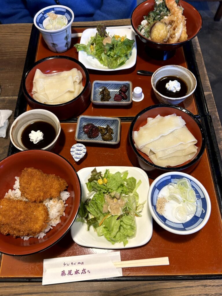 ぶらぶらしているとお昼になりましたので、藤屋本店に入ります。このお店は明治時代に開業した、創業120年の老舗です。私は、桐生の名物のひもかわうどんと昨日に続きますがソースカツ丼のセットを頂きました。妻は天丼のセットです。それにしても渡良瀬川沿いは、ソースカツ丼がどこでも名物ですね。