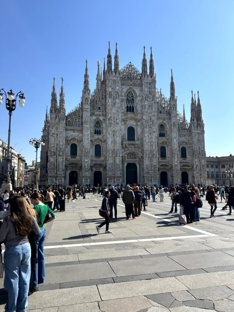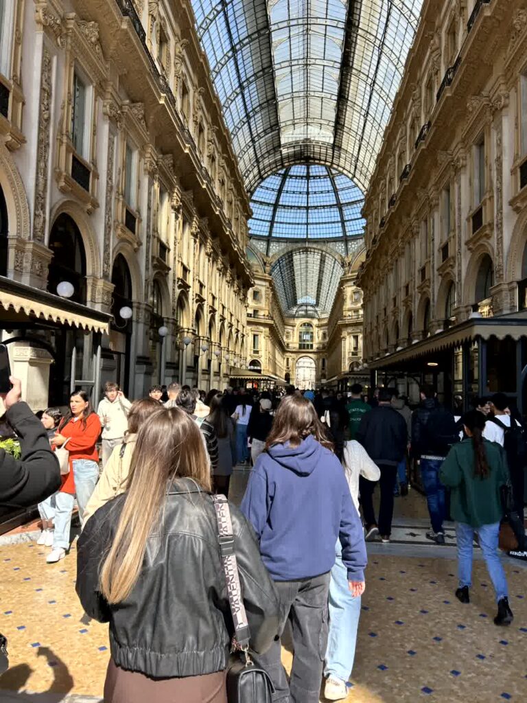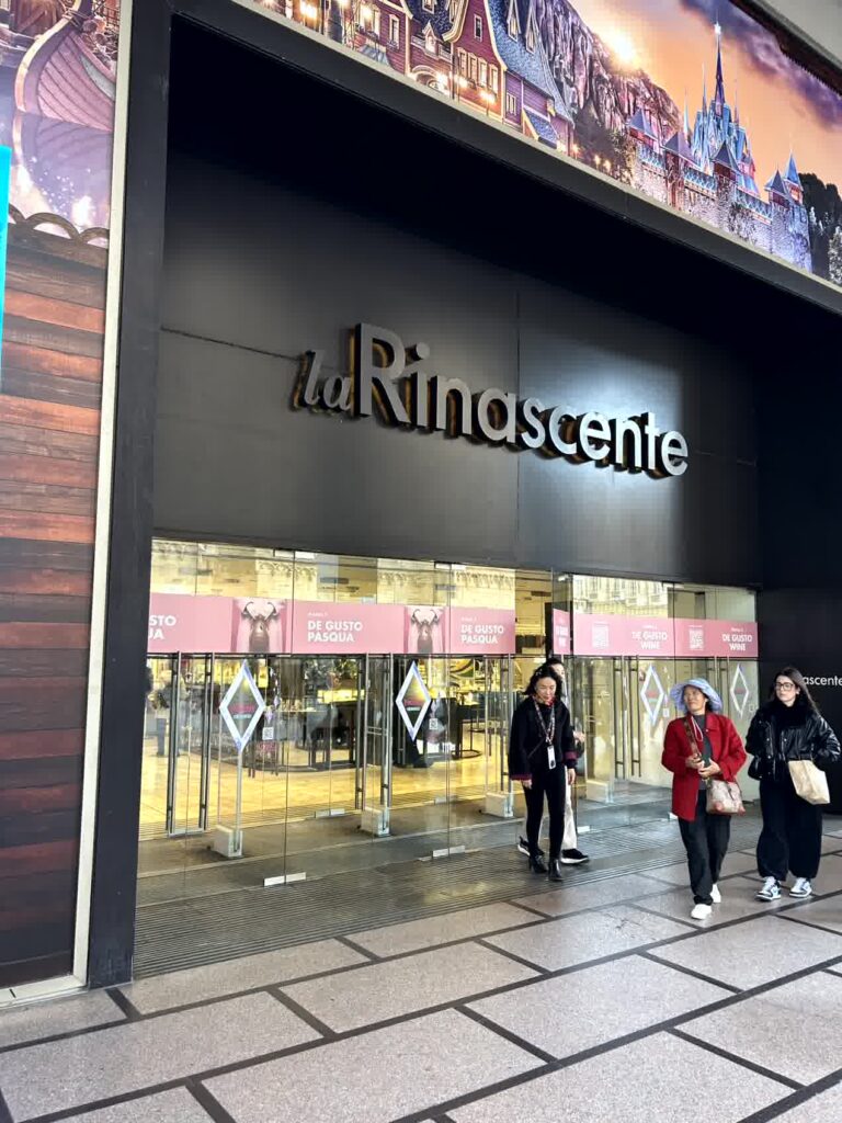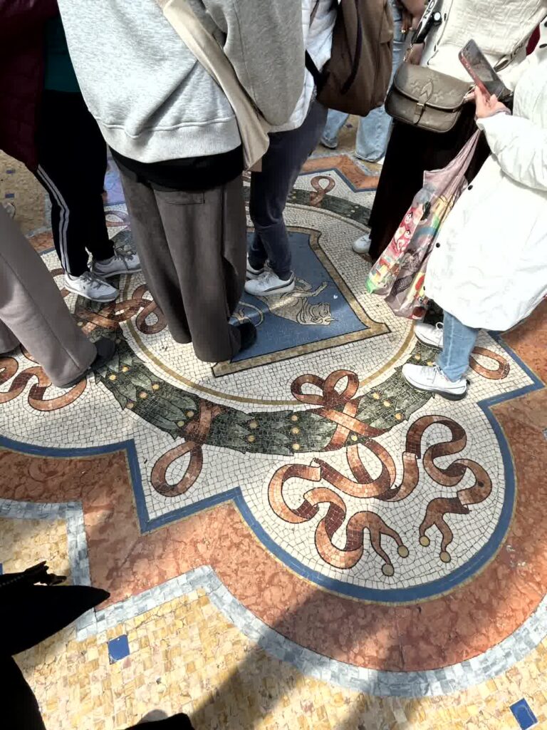 次は、デパートのリナシェンテに行くため、ドゥオーモに向かいます。ドゥオーモ脇のガッレリアに入り、地面の雄牛のモザイク画の急所部分に靴のかかとを入れ、ぐるぐる回る光景を見ます。こうすると願いが叶うとされていて、前回来た際、私もしてみました。ガッレリアを出て、ドゥオーモの奥側のリナシェンテに入ります。