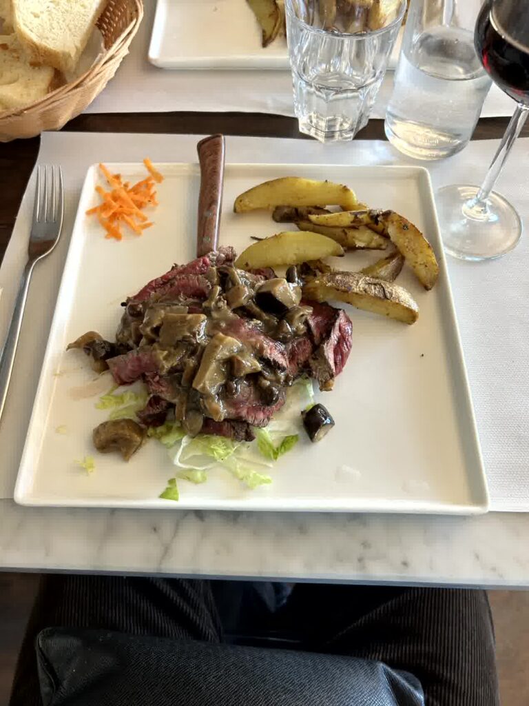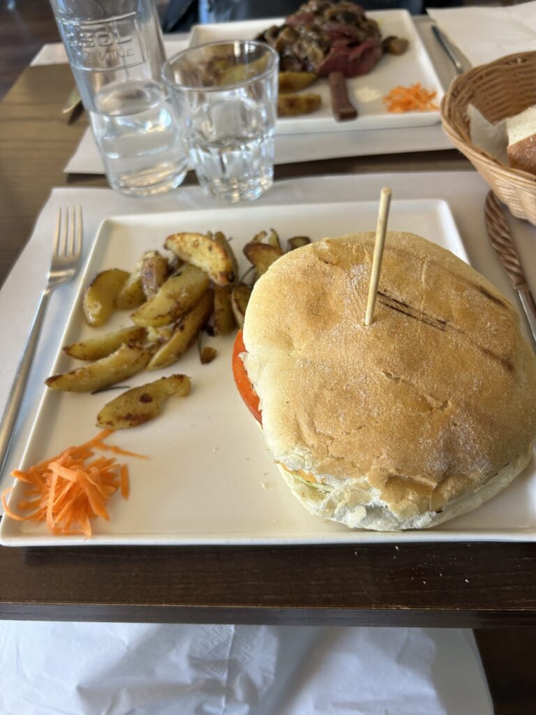 買い物をしていると、お昼時となりました。今回の旅行では、パスタやリゾットなど炭水化物系が多かったので、最後は肉でガツンと行きたいと思います。例によってAIに肉が手軽に食べられるところを聞いたところ「Da Mario Steak House」を紹介されたので、行ってみます。確かにこの店はお手軽な店らしく、昼食時のサラリーマンや工事関係者など、地元の人が大勢入店してきます。アルゼンチン産アンガスビーフのスライス300g以上とチーズハンバーガーをお願いしました。肉はボリュームが多く、全部食べきれないほどでした。