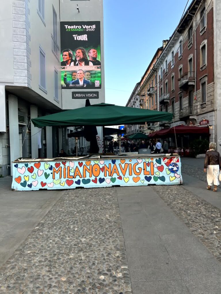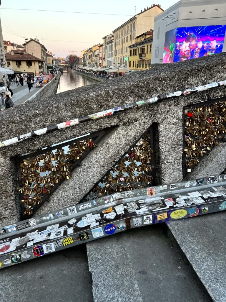 ミラノの最後は、ナヴィリオ地区のナヴィリオ・グランデ沿いのエリアで、アペリティーボを楽しみたいと思います。ミラノ中央駅から、地下鉄緑線(linea2)でポルタジェノバ駅で下車し、徒歩で約5分で、ミラノでは珍しくなった運河が現れます。運河沿いに、既に大勢の人々が行き来していますが、運河に架かるアルダ・メリーニ橋には愛の南京錠がぎっしりかけられ、下の部分にはステッカーが隙間無く張られています。橋のたもとには、南京錠売りが居ます。