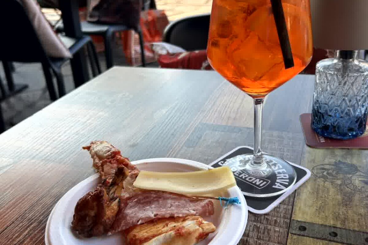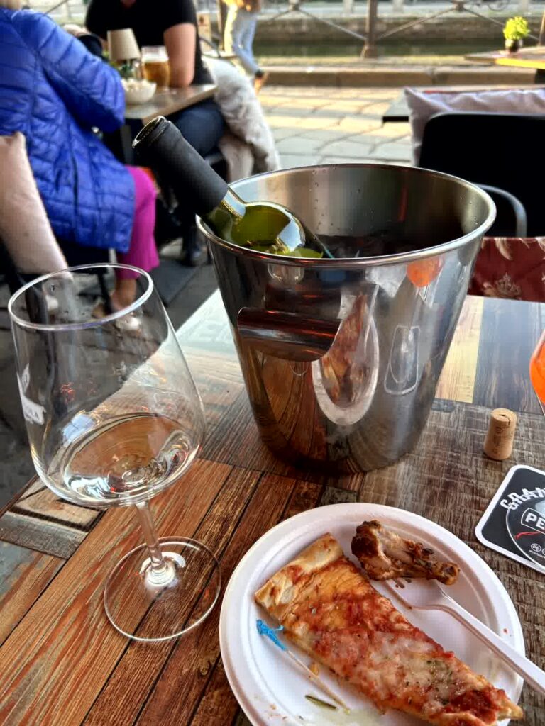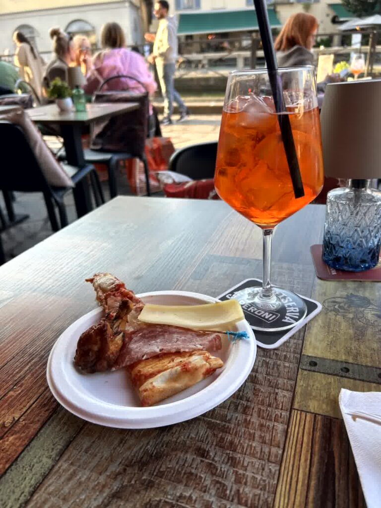 アペリティーボは「食前酒」という意味ですが、ここミラノ(イタリア全土かも?)でアペリティーボと言えば、ドリンク一杯とブッフェ形式の食事が食べ放題というシステムです。調子の良い呼び子に声を掛けられた事もあり、運河沿いの「La contea navigli」に入ります。アペリティーボのお酒は、イタリアの定番スプリッツをお願いしました。食事はフリーなので、ここで夕食もとることとし、ワインも追加し、暮れなずむ空を見ながら、ミラノの最後の夜を過ごしました。